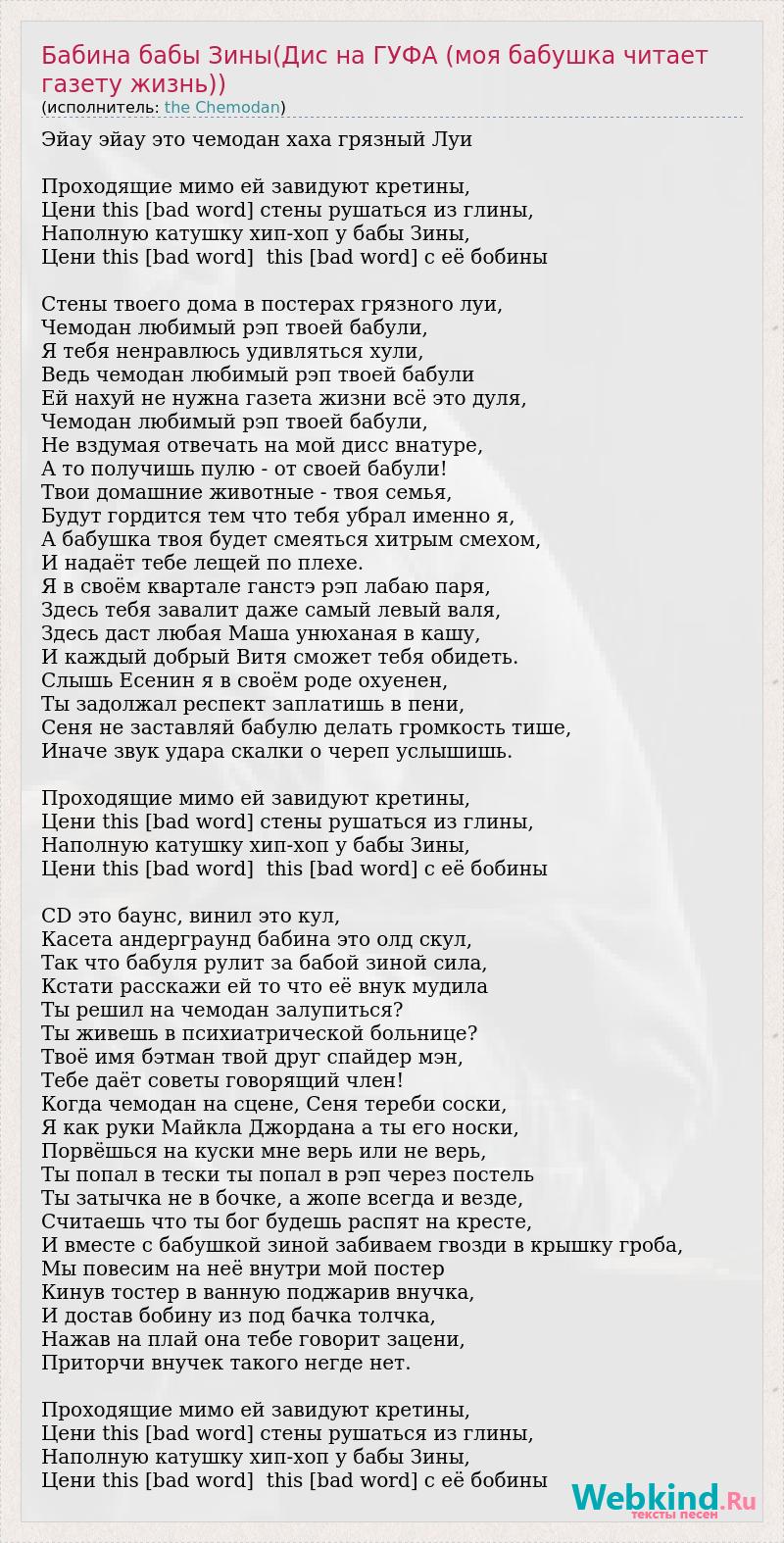 Эйау эйау это чемодан хаха грязный Луи Проходящие мимо ей завидуют кретины, Цени this [bad word] стены рушаться из глины, Наполную катушку хип-хоп у бабы Зины, Цени this [bad word] this [bad word] с её бобины Стены твоего дома в постерах грязного луи, Чемодан любимый рэп твоей бабули, Я тебя ненравлюсь удивляться хули, Ведь чемодан любимый рэп твоей бабули Ей нахуй не нужна газета жизни всё это дуля, Чемодан любимый рэп твоей бабули, Не вздумая отвечать на мой дисс внатуре, А то получишь пулю - от своей бабули! Твои домашние животные - твоя семья, Будут гордится тем что тебя убрал именно я, А бабушка твоя будет смеяться хитрым смехом, И надаёт тебе лещей по плехе. Я в своём квартале ганстэ рэп лабаю паря, Здесь тебя завалит даже самый левый валя, Здесь даст любая Маша унюханая в кашу, И каждый добрый Витя сможет тебя обидеть. Слышь Есенин я в своём роде охуенен, Ты задолжал респект заплатишь в пени, Сеня не заставляй бабулю делать громкость тише, Иначе звук удара скалки о череп услышишь. Проходящие мимо ей завидуют кретины, Цени this [bad word] стены рушаться из глины, Наполную катушку хип-хоп у бабы Зины, Цени this [bad word] this [bad word] с её бобины CD это баунc, винил это кул, Касета андерграунд бабина это олд скул, Так что бабуля рулит за бабой зиной сила, Кстати расскажи ей то что её внук мудила Ты решил на чемодан залупиться? Ты живешь в психиатрической больнице? Твоё имя бэтман твой друг спайдер мэн, Тебе даёт советы говорящий член! Когда чемодан на сцене, Сеня тереби соски, Я как руки Майкла Джордана а ты его носки, Порвёшься на куски мне верь или не верь, Ты попал в тески ты попал в рэп через постель Ты затычка не в бочке, а жопе всегда и везде, Считаешь что ты бог будешь распят на кресте, И вместе с бабушкой зиной забиваем гвозди в крышку гроба, Мы повесим на неё внутри мой постер Кинув тостер в ванную поджарив внучка, И достав бобину из под бачка толчка, Нажав на плай она тебе говорит зацени, Приторчи внучек такого негде нет. Проходящие мимо ей завидуют кретины, Цени this [bad word] стены рушаться из глины, Наполную катушку хип-хоп у бабы Зины, Цени this [bad word] this [bad word] с её бобины