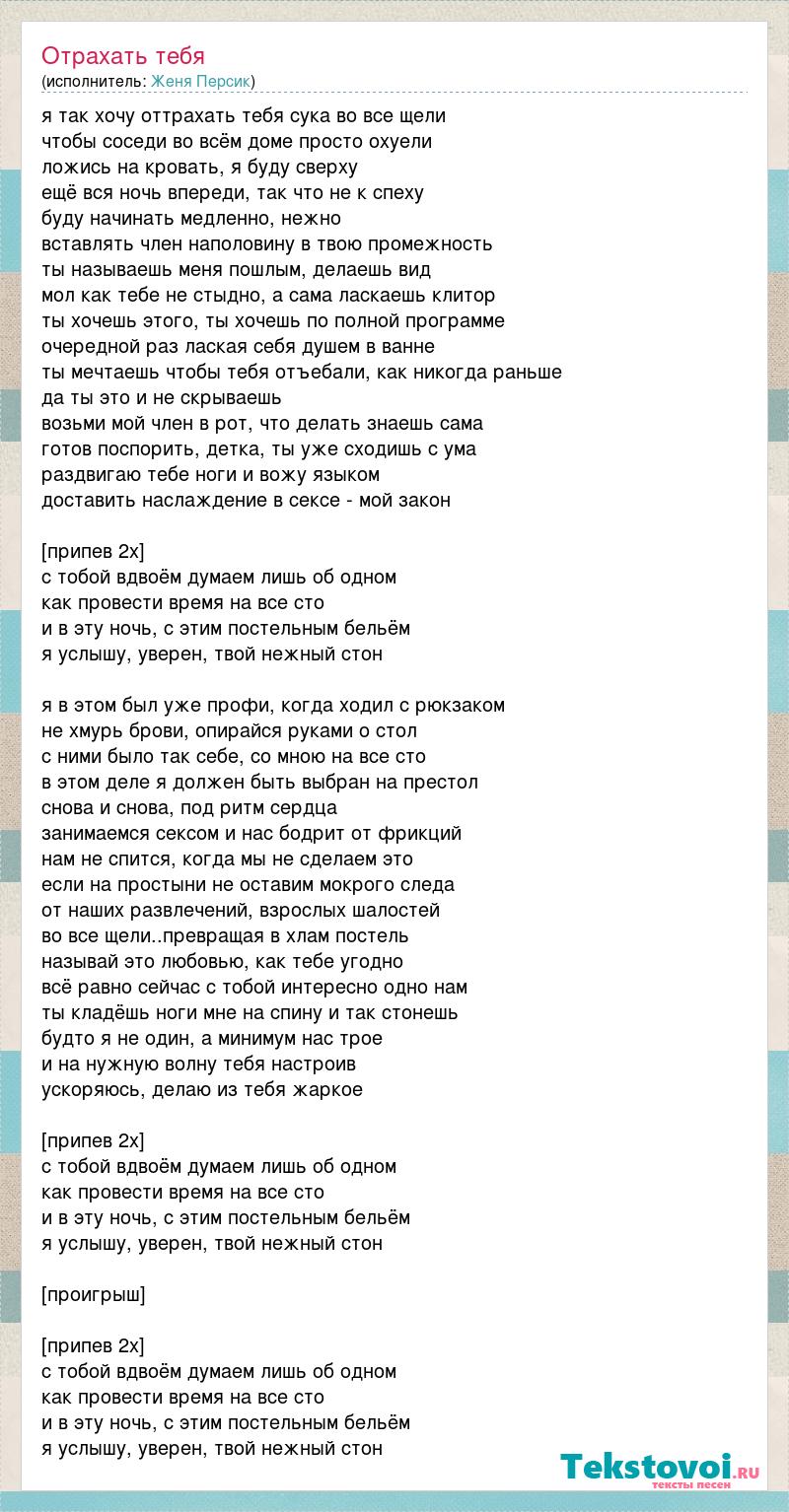 я так хочу оттрахать тебя сука во все щели чтобы соседи во всём доме просто охуели ложись на кровать, я буду сверху ещё вся ночь впереди, так что не к спеху буду начинать медленно, нежно вставлять член наполовину в твою промежность ты называешь меня пошлым, делаешь вид мол как тебе не стыдно, а сама ласкаешь клитор ты хочешь этого, ты хочешь по полной программе очередной раз лаская себя душем в ванне ты мечтаешь чтобы тебя отъебали, как никогда раньше да ты это и не скрываешь возьми мой член в рот, что делать знаешь сама готов поспорить, детка, ты уже сходишь с ума раздвигаю тебе ноги и вожу языком доставить наслаждение в сексе - мой закон [припев 2х] с тобой вдвоём думаем лишь об одном как провести время на все сто и в эту ночь, с этим постельным бельём я услышу, уверен, твой нежный стон я в этом был уже профи, когда ходил с рюкзаком не хмурь брови, опирайся руками о стол с ними было так себе, со мною на все сто в этом деле я должен быть выбран на престол снова и снова, под ритм сердца занимаемся сексом и нас бодрит от фрикций нам не спится, когда мы не сделаем это если на простыни не оставим мокрого следа от наших развлечений, взрослых шалостей во все щели..превращая в хлам постель называй это любовью, как тебе угодно всё равно сейчас с тобой интересно одно нам ты кладёшь ноги мне на спину и так стонешь будто я не один, а минимум нас трое и на нужную волну тебя настроив ускоряюсь, делаю из тебя жаркое [припев 2х] с тобой вдвоём думаем лишь об одном как провести время на все сто и в эту ночь, с этим постельным бельём я услышу, уверен, твой нежный стон [проигрыш] [припев 2х] с тобой вдвоём думаем лишь об одном как провести время на все сто и в эту ночь, с этим постельным бельём я услышу, уверен, твой нежный стон