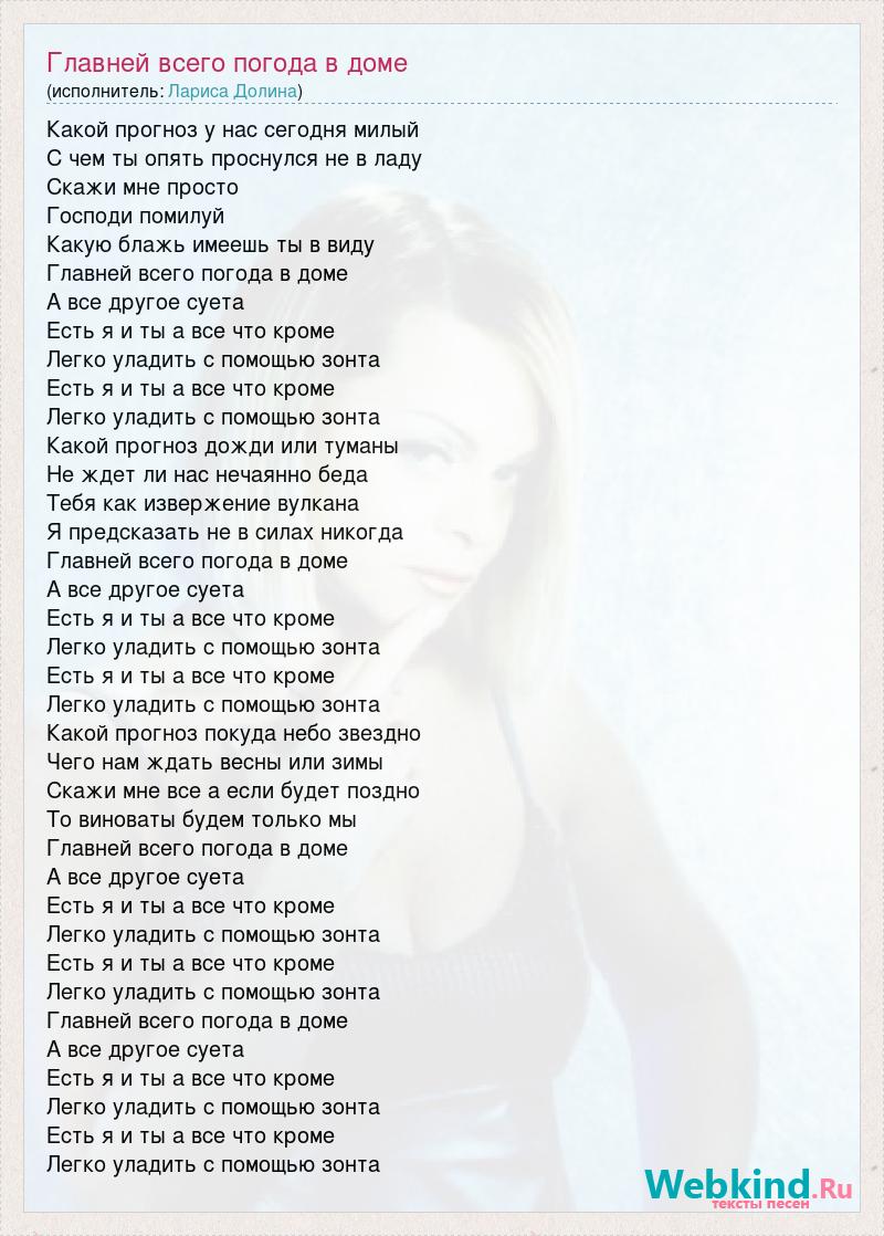 Какой прогноз у нас сегодня милый С чем ты опять проснулся не в ладу Скажи мне просто Господи помилуй Какую блажь имеешь ты в виду Главней всего погода в доме А все другое суета Есть я и ты а все что кроме Легко уладить с помощью зонта Есть я и ты а все что кроме Легко уладить с помощью зонта Какой прогноз дожди или туманы Не ждет ли нас нечаянно беда Тебя как извержение вулкана Я предсказать не в силах никогда Главней всего погода в доме А все другое суета Есть я и ты а все что кроме Легко уладить с помощью зонта Есть я и ты а все что кроме Легко уладить с помощью зонта Какой прогноз покуда небо звездно Чего нам ждать весны или зимы Скажи мне все а если будет поздно То виноваты будем только мы Главней всего погода в доме А все другое суета Есть я и ты а все что кроме Легко уладить с помощью зонта Есть я и ты а все что кроме Легко уладить с помощью зонта Главней всего погода в доме А все другое суета Есть я и ты а все что кроме Легко уладить с помощью зонта Есть я и ты а все что кроме Легко уладить с помощью зонта