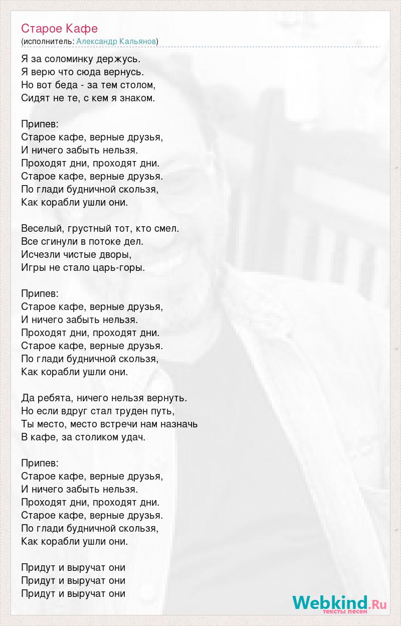 Я за соломинку держусь. Я верю что сюда вернусь. Но вот беда - за тем столом, Сидят не те, с кем я знаком. Припев: Старое кафе, верные друзья, И ничего забыть нельзя. Проходят дни, проходят дни. Старое кафе, верные друзья. По глади будничной скользя, Как корабли ушли они. Веселый, грустный тот, кто смел. Все сгинули в потоке дел. Исчезли чистые дворы, Игры не стало царь-горы. Припев: Старое кафе, верные друзья, И ничего забыть нельзя. Проходят дни, проходят дни. Старое кафе, верные друзья. По глади будничной скользя, Как корабли ушли они. Да ребята, ничего нельзя вернуть. Но если вдруг стал труден путь, Ты место, место встречи нам назначь В кафе, за столиком удач. Припев: Старое кафе, верные друзья, И ничего забыть нельзя. Проходят дни, проходят дни. Старое кафе, верные друзья. По глади будничной скользя, Как корабли ушли они. Придут и выручат они Придут и выручат они Придут и выручат они