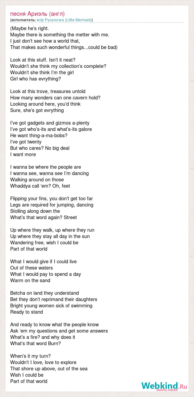 (Maybe he’s right. Maybe there is something the metter with me. I just don’t see how a world that, That makes such wonderful things...could be bad) Look at this stuff. Isn’t it neat? Wouldn’t she think my collection’s complete? Wouldn’t she think I’m the girl Girl who has evrything? Look at this trove, treasures untold How many wonders can one cavern hold? Looking around here, you’d think Sure, she’s got evrything I’ve got gadgets and gizmos a-plenty I’ve got who’s-its and what’s-its galore He want thing-a-ma-bobs? I’ve got twenty But who cares? No big deal I want more I wanna be where the people are I wanna see, wanna see I’m dancing Walking around on those Whaddya call ‘em? Oh, feet Flipping your fins, you don’t get too far Legs are required for jumping, dancing Stolling along down the What’s that word again? Street Up where they walk, up where they run Up where they stay all day in the sun Wandering free, wish I could be Part of that world What I would give if I could live Out of these waters What I would pay to spend a day Warm on the sand Betcha on land they understand Bet they don’t reprimand their daughters Bright young women sick of swimming Ready to stand And ready to know what the people know Ask ‘em my questions and get some answers What’s a fire? and why does it What’s that word Burn? When’s it my turn? Wouldn’t I love, love to explore That shore up above, out of the sea Wish I could be Part of that world