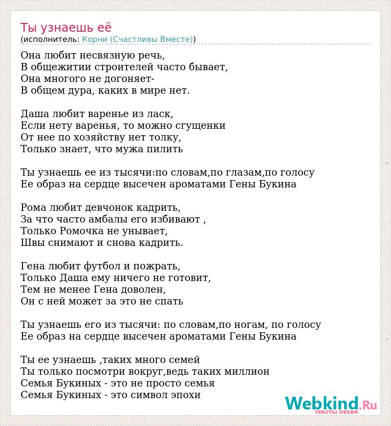 Она любит несвязную речь, В общежитии строителей часто бывает, Она многого не догоняет- В общем дура, каких в мире нет. Даша любит варенье из ласк, Если нету варенья, то можно сгущенки От нее по хозяйству нет толку, Только знает, что мужа пилить Ты узнаешь ее из тысячи:по словам,по глазам,по голосу Ее образ на сердце высечен ароматами Гены Букина Рома любит девчонок кадрить, За что часто амбалы его избивают , Только Ромочка не унывает, Швы снимают и снова кадрить. Гена любит футбол и пожрать, Только Даша ему ничего не готовит, Тем не менее Гена доволен, Он с ней может за это не спать Ты узнаешь его из тысячи: по словам,по ногам, по голосу Ее образ на сердце высечен ароматами Гены Букина Ты ее узнаешь ,таких много семей Ты только посмотри вокруг,ведь таких миллион Семья Букиных - это не просто семья Семья Букиных - это символ эпохи