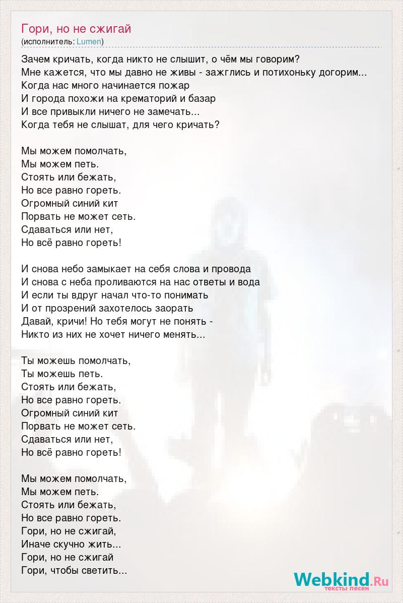 Зачем кричать, когда никто не слышит, о чём мы говорим? Мне кажется, что мы давно не живы - зажглись и потихоньку догорим... Когда нас много начинается пожар И города похожи на крематорий и базар И все привыкли ничего не замечать... Когда тебя не слышат, для чего кричать? Мы можем помолчать, Мы можем петь. Стоять или бежать, Но все равно гореть. Огромный синий кит Порвать не может сеть. Сдаваться или нет, Но всё равно гореть! И снова небо замыкает на себя слова и провода И снова с неба проливаются на нас ответы и вода И если ты вдруг начал что-то понимать И от прозрений захотелось заорать Давай, кричи! Но тебя могут не понять - Никто из них не хочет ничего менять... Ты можешь помолчать, Ты можешь петь. Стоять или бежать, Но все равно гореть. Огромный синий кит Порвать не может сеть. Сдаваться или нет, Но всё равно гореть! Мы можем помолчать, Мы можем петь. Стоять или бежать, Но все равно гореть. Гори, но не сжигай, Иначе скучно жить... Гори, но не сжигай Гори, чтобы светить...