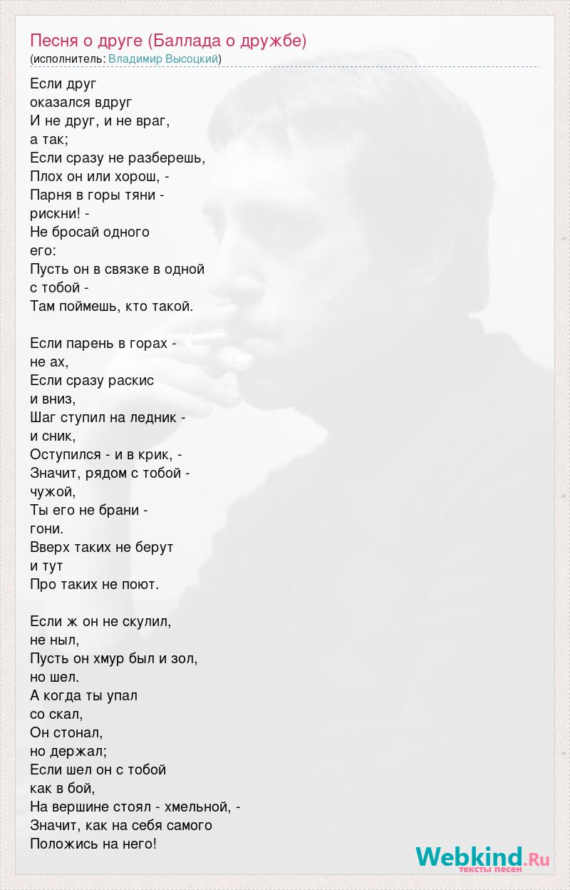 Если друг оказался вдруг И не друг, и не враг, а так; Если сразу не разберешь, Плох он или хорош, - Парня в горы тяни - рискни! - Не бросай одного его: Пусть он в связке в одной с тобой - Там поймешь, кто такой. Если парень в горах - не ах, Если сразу раскис и вниз, Шаг ступил на ледник - и сник, Оступился - и в крик, - Значит, рядом с тобой - чужой, Ты его не брани - гони. Вверх таких не берут и тут Про таких не поют. Если ж он не скулил, не ныл, Пусть он хмур был и зол, но шел. А когда ты упал со скал, Он стонал, но держал; Если шел он с тобой как в бой, На вершине стоял - хмельной, - Значит, как на себя самого Положись на него!