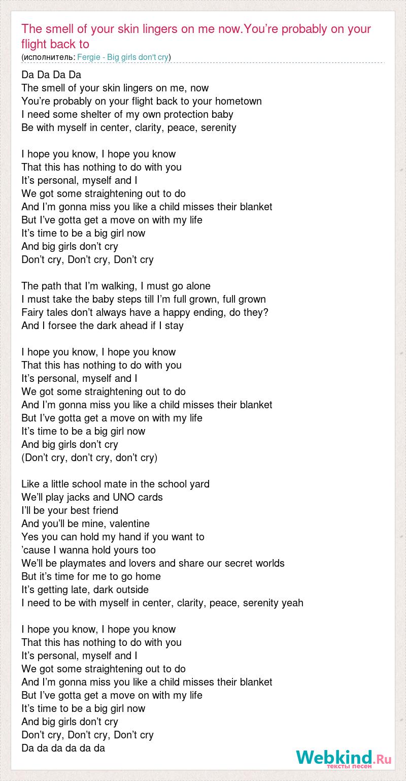 Главная→Исполнители→Fergie - Big girls don't cry→The smell of your skin lingers on me now.You’re probably on your flight b