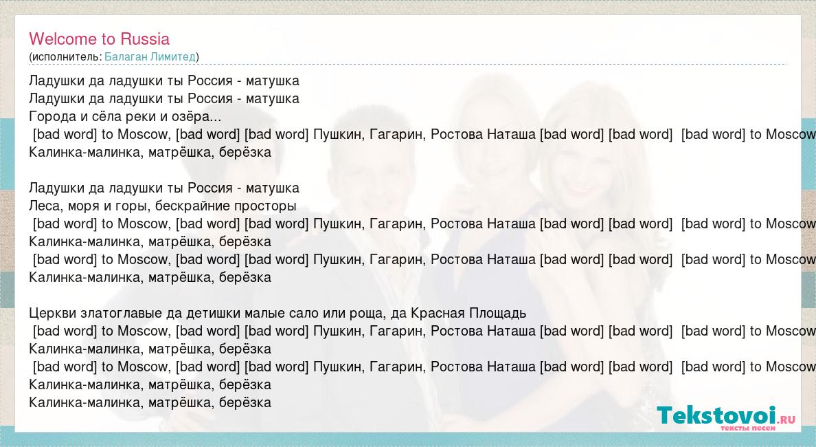 Ладушки да ладушки ты Россия - матушка Ладушки да ладушки ты Россия - матушка Города и сёла реки и озёра... Welcome to Moscow, Welcome to Russia Пушкин, Гагарин, Ростова Наташа Welcome to Russia, Welcome to Moscow Калинка-малинка, матрёшка, берёзка Ладушки да ладушки ты Россия - матушка Леса, моря и горы, бескрайние просторы Welcome to Moscow, welcome to Russia Пушкин, Гагарин, Ростова Наташа Welcome to Russia, Welcome to Moscow Калинка-малинка, матрёшка, берёзка Welcome to Moscow, welcome to Russia Пушкин, Гагарин, Ростова Наташа Welcome to Russia, Welcome to Moscow Калинка-малинка, матрёшка, берёзка Церкви златоглавые да детишки малые сало или роща, да Красная Площадь Welcome to Moscow, welcome to Russia Пушкин, Гагарин, Ростова Наташа Welcome to Russia, Welcome to Moscow Калинка-малинка, матрёшка, берёзка Welcome to Moscow, welcome to Russia Пушкин, Гагарин, Ростова Наташа Welcome to Russia, Welcome to Moscow Калинка-малинка, матрёшка, берёзка Калинка-малинка, матрёшка, берёзка