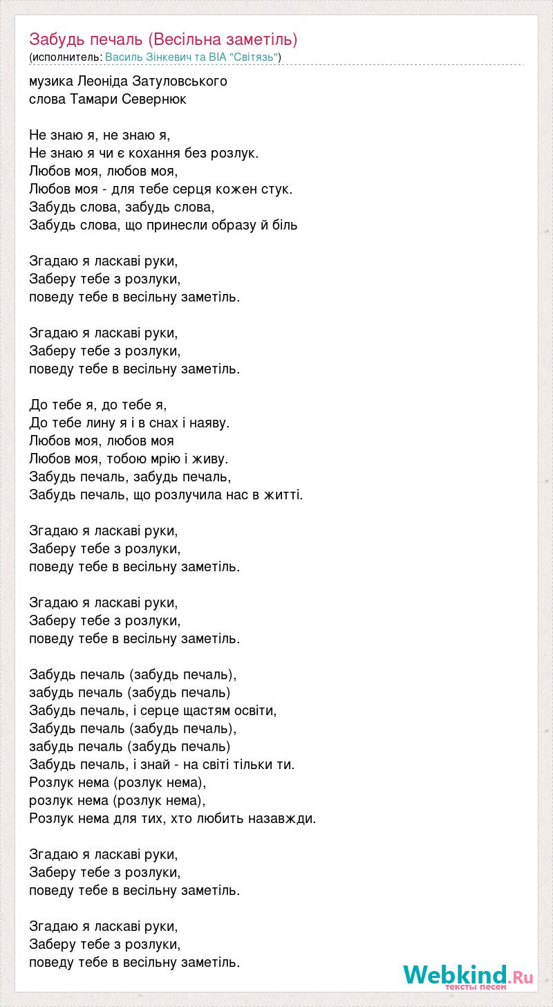 музика Леоніда Затуловського слова Тамари Севернюк Не знаю я, не знаю я, Не знаю я чи є кохання без розлук. Любов моя, любов моя, Любов моя - для тебе серця кожен стук. Забудь слoва, забудь слова, Забудь слова, що принесли образу й біль Згадаю я ласкаві руки, Заберу тебе з розлуки, поведу тебе в весільну заметіль. Згадаю я ласкаві руки, Заберу тебе з розлуки, поведу тебе в весільну заметіль. До тебе я, до тебе я, До тебе лину я і в снах і наяву. Любов моя, любов моя Любов моя, тобою мрію і живу. Забудь печаль, забудь печаль, Забудь печаль, що розлучила нас в житті. Згадаю я ласкаві руки, Заберу тебе з розлуки, поведу тебе в весільну заметіль. Згадаю я ласкаві руки, Заберу тебе з розлуки, поведу тебе в весільну заметіль. Забудь печаль (забудь печаль), забудь печаль (забудь печаль) Забудь печаль, і серце щастям освіти, Забудь печаль (забудь печаль), забудь печаль (забудь печаль) Забудь печаль, і знай - на світі тільки ти. Розлук нема (розлук нема), розлук нема (розлук нема), Розлук нема для тих, хто любить назавжди. Згадаю я ласкаві руки, Заберу тебе з розлуки, поведу тебе в весільну заметіль. Згадаю я ласкаві руки, Заберу тебе з розлуки, поведу тебе в весільну заметіль.