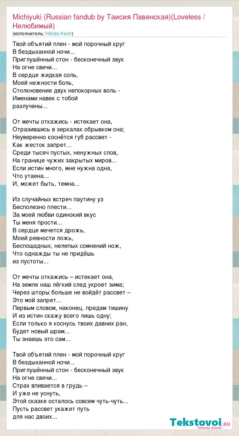 Главная→Исполнители→Hikida Kaori→Michiyuki (Russian fandub by Таисия Павенская)(Loveless / Нелюбимый)