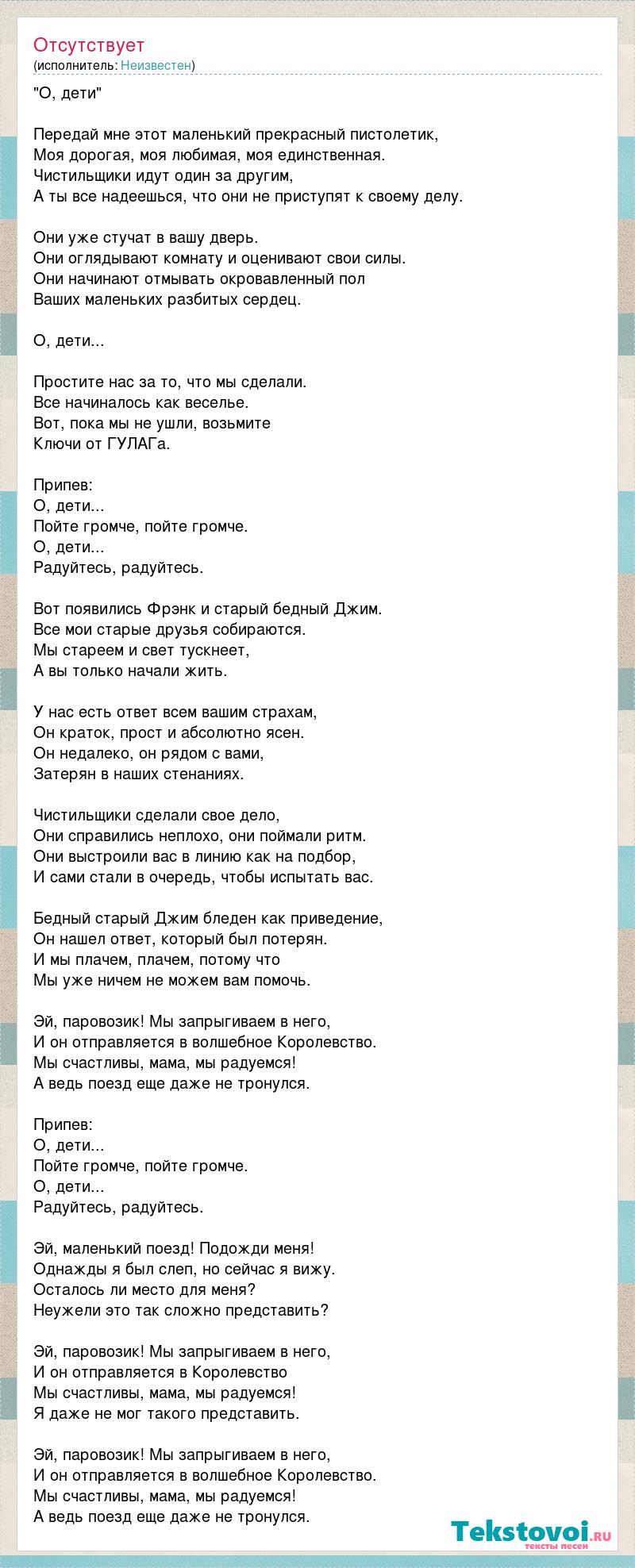 "О, дети" Передай мне этот маленький прекрасный пистолетик, Моя дорогая, моя любимая, моя единственная. Чистильщики идут один за другим, А ты все надеешься, что они не приступят к своему делу. Они уже стучат в вашу дверь. Они оглядывают комнату и оценивают свои силы. Они начинают отмывать окровавленный пол Ваших маленьких разбитых сердец. О, дети... Простите нас за то, что мы сделали. Все начиналось как веселье. Вот, пока мы не ушли, возьмите Ключи от ГУЛАГа. Припев: О, дети... Пойте громче, пойте громче. О, дети... Радуйтесь, радуйтесь. Вот появились Фрэнк и старый бедный Джим. Все мои старые друзья собираются. Мы стареем и свет тускнеет, А вы только начали жить. У нас есть ответ всем вашим страхам, Он краток, прост и абсолютно ясен. Он недалеко, он рядом с вами, Затерян в наших стенаниях. Чистильщики сделали свое дело, Они справились неплохо, они поймали ритм. Они выстроили вас в линию как на подбор, И сами стали в очередь, чтобы испытать вас. Бедный старый Джим бледен как приведение, Он нашел ответ, который был потерян. И мы плачем, плачем, потому что Мы уже ничем не можем вам помочь. Эй, паровозик! Мы запрыгиваем в него, И он отправляется в волшебное Королевство. Мы счастливы, мама, мы радуемся! А ведь поезд еще даже не тронулся. Припев: О, дети... Пойте громче, пойте громче. О, дети... Радуйтесь, радуйтесь. Эй, маленький поезд! Подожди меня! Однажды я был слеп, но сейчас я вижу. Осталось ли место для меня? Неужели это так сложно представить? Эй, паровозик! Мы запрыгиваем в него, И он отправляется в Королевство Мы счастливы, мама, мы радуемся! Я даже не мог такого представить. Эй, паровозик! Мы запрыгиваем в него, И он отправляется в волшебное Королевство. Мы счастливы, мама, мы радуемся! А ведь поезд еще даже не тронулся.