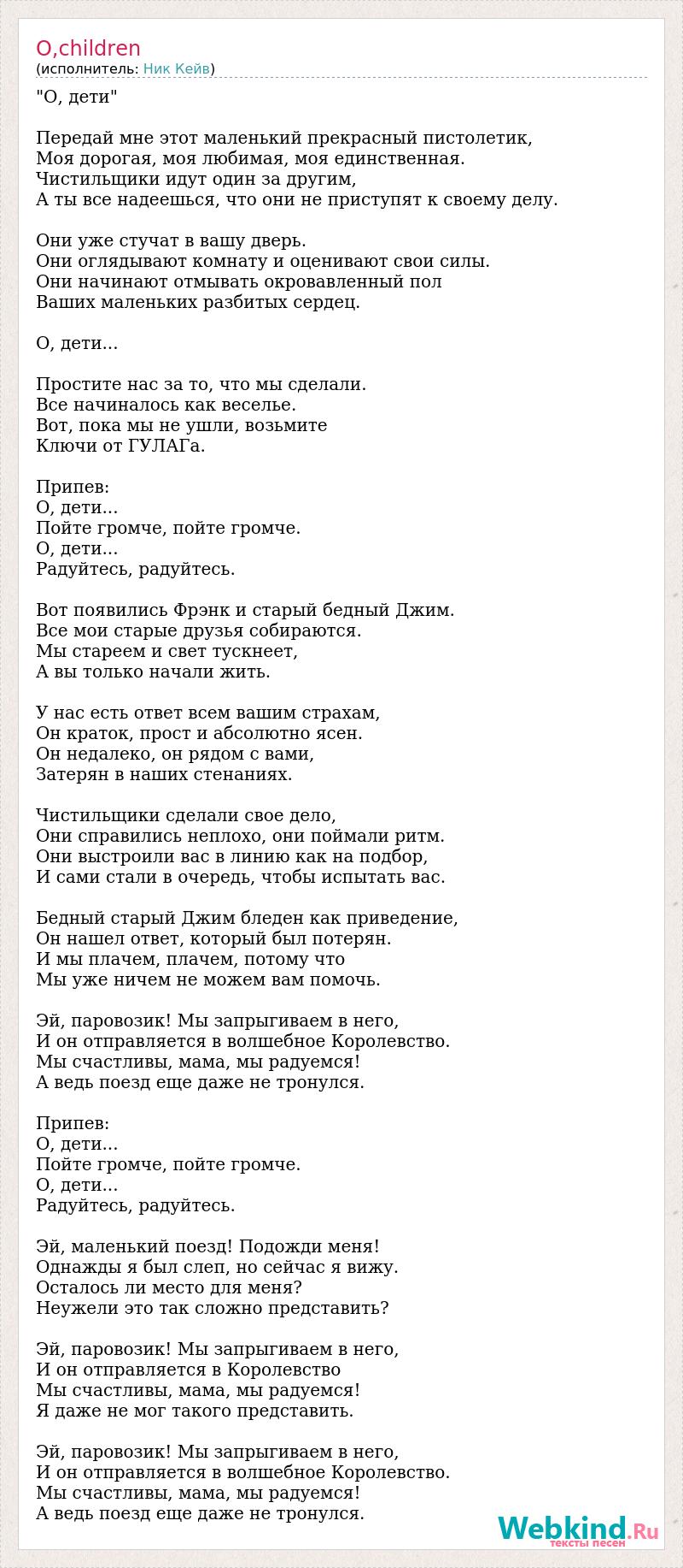 "О, дети" Передай мне этот маленький прекрасный пистолетик, Моя дорогая, моя любимая, моя единственная. Чистильщики идут один за другим, А ты все надеешься, что они не приступят к своему делу. Они уже стучат в вашу дверь. Они оглядывают комнату и оценивают свои силы. Они начинают отмывать окровавленный пол Ваших маленьких разбитых сердец. О, дети... Простите нас за то, что мы сделали. Все начиналось как веселье. Вот, пока мы не ушли, возьмите Ключи от ГУЛАГа. Припев: О, дети... Пойте громче, пойте громче. О, дети... Радуйтесь, радуйтесь. Вот появились Фрэнк и старый бедный Джим. Все мои старые друзья собираются. Мы стареем и свет тускнеет, А вы только начали жить. У нас есть ответ всем вашим страхам, Он краток, прост и абсолютно ясен. Он недалеко, он рядом с вами, Затерян в наших стенаниях. Чистильщики сделали свое дело, Они справились неплохо, они поймали ритм. Они выстроили вас в линию как на подбор, И сами стали в очередь, чтобы испытать вас. Бедный старый Джим бледен как приведение, Он нашел ответ, который был потерян. И мы плачем, плачем, потому что Мы уже ничем не можем вам помочь. Эй, паровозик! Мы запрыгиваем в него, И он отправляется в волшебное Королевство. Мы счастливы, мама, мы радуемся! А ведь поезд еще даже не тронулся. Припев: О, дети... Пойте громче, пойте громче. О, дети... Радуйтесь, радуйтесь. Эй, маленький поезд! Подожди меня! Однажды я был слеп, но сейчас я вижу. Осталось ли место для меня? Неужели это так сложно представить? Эй, паровозик! Мы запрыгиваем в него, И он отправляется в Королевство Мы счастливы, мама, мы радуемся! Я даже не мог такого представить. Эй, паровозик! Мы запрыгиваем в него, И он отправляется в волшебное Королевство. Мы счастливы, мама, мы радуемся! А ведь поезд еще даже не тронулся.