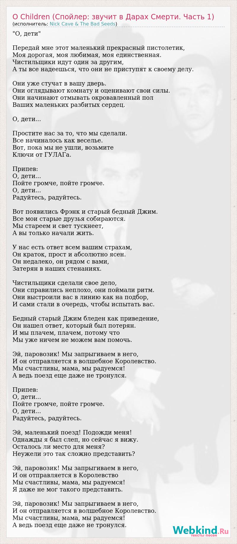 "О, дети" Передай мне этот маленький прекрасный пистолетик, Моя дорогая, моя любимая, моя единственная. Чистильщики идут один за другим, А ты все надеешься, что они не приступят к своему делу. Они уже стучат в вашу дверь. Они оглядывают комнату и оценивают свои силы. Они начинают отмывать окровавленный пол Ваших маленьких разбитых сердец. О, дети... Простите нас за то, что мы сделали. Все начиналось как веселье. Вот, пока мы не ушли, возьмите Ключи от ГУЛАГа. Припев: О, дети... Пойте громче, пойте громче. О, дети... Радуйтесь, радуйтесь. Вот появились Фрэнк и старый бедный Джим. Все мои старые друзья собираются. Мы стареем и свет тускнеет, А вы только начали жить. У нас есть ответ всем вашим страхам, Он краток, прост и абсолютно ясен. Он недалеко, он рядом с вами, Затерян в наших стенаниях. Чистильщики сделали свое дело, Они справились неплохо, они поймали ритм. Они выстроили вас в линию как на подбор, И сами стали в очередь, чтобы испытать вас. Бедный старый Джим бледен как приведение, Он нашел ответ, который был потерян. И мы плачем, плачем, потому что Мы уже ничем не можем вам помочь. Эй, паровозик! Мы запрыгиваем в него, И он отправляется в волшебное Королевство. Мы счастливы, мама, мы радуемся! А ведь поезд еще даже не тронулся. Припев: О, дети... Пойте громче, пойте громче. О, дети... Радуйтесь, радуйтесь. Эй, маленький поезд! Подожди меня! Однажды я был слеп, но сейчас я вижу. Осталось ли место для меня? Неужели это так сложно представить? Эй, паровозик! Мы запрыгиваем в него, И он отправляется в Королевство Мы счастливы, мама, мы радуемся! Я даже не мог такого представить. Эй, паровозик! Мы запрыгиваем в него, И он отправляется в волшебное Королевство. Мы счастливы, мама, мы радуемся! А ведь поезд еще даже не тронулся.