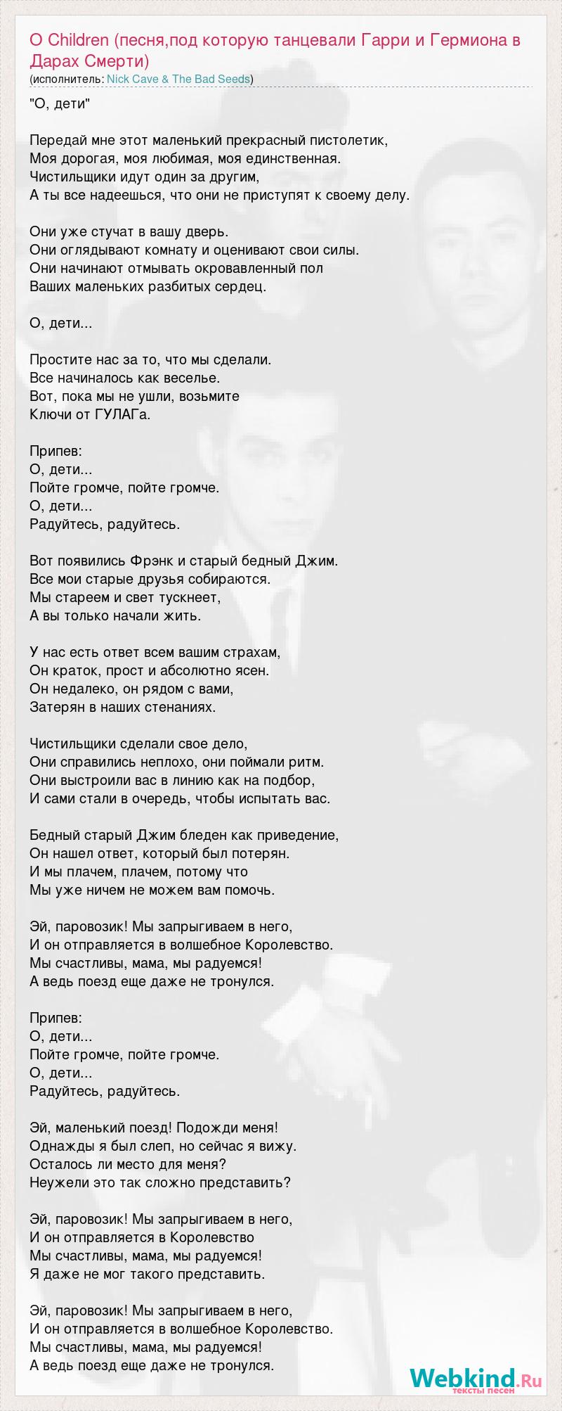 Главная→Исполнители→Nick Cave & The Bad Seeds→O Children (песня,под которую танцевали Гарри и Гермиона в Дарах Смерти)