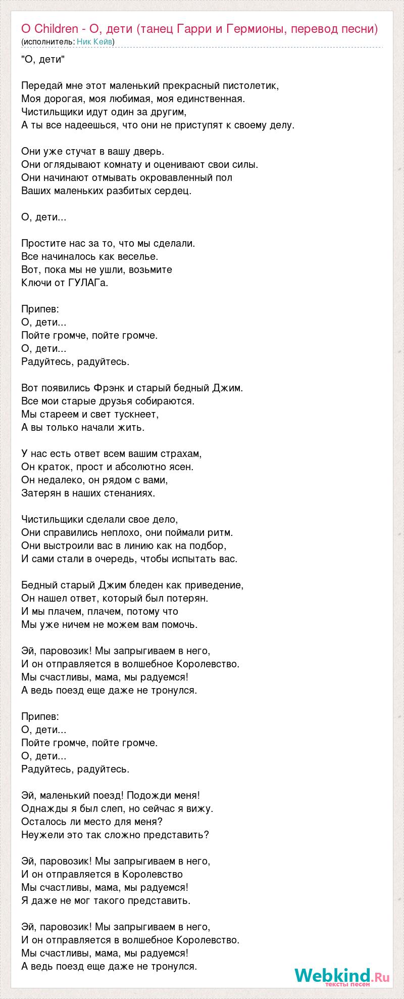 "О, дети" Передай мне этот маленький прекрасный пистолетик, Моя дорогая, моя любимая, моя единственная. Чистильщики идут один за другим, А ты все надеешься, что они не приступят к своему делу. Они уже стучат в вашу дверь. Они оглядывают комнату и оценивают свои силы. Они начинают отмывать окровавленный пол Ваших маленьких разбитых сердец. О, дети... Простите нас за то, что мы сделали. Все начиналось как веселье. Вот, пока мы не ушли, возьмите Ключи от ГУЛАГа. Припев: О, дети... Пойте громче, пойте громче. О, дети... Радуйтесь, радуйтесь. Вот появились Фрэнк и старый бедный Джим. Все мои старые друзья собираются. Мы стареем и свет тускнеет, А вы только начали жить. У нас есть ответ всем вашим страхам, Он краток, прост и абсолютно ясен. Он недалеко, он рядом с вами, Затерян в наших стенаниях. Чистильщики сделали свое дело, Они справились неплохо, они поймали ритм. Они выстроили вас в линию как на подбор, И сами стали в очередь, чтобы испытать вас. Бедный старый Джим бледен как приведение, Он нашел ответ, который был потерян. И мы плачем, плачем, потому что Мы уже ничем не можем вам помочь. Эй, паровозик! Мы запрыгиваем в него, И он отправляется в волшебное Королевство. Мы счастливы, мама, мы радуемся! А ведь поезд еще даже не тронулся. Припев: О, дети... Пойте громче, пойте громче. О, дети... Радуйтесь, радуйтесь. Эй, маленький поезд! Подожди меня! Однажды я был слеп, но сейчас я вижу. Осталось ли место для меня? Неужели это так сложно представить? Эй, паровозик! Мы запрыгиваем в него, И он отправляется в Королевство Мы счастливы, мама, мы радуемся! Я даже не мог такого представить. Эй, паровозик! Мы запрыгиваем в него, И он отправляется в волшебное Королевство. Мы счастливы, мама, мы радуемся! А ведь поезд еще даже не тронулся.