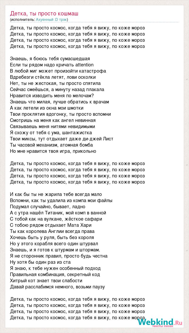 Детка, ты просто космос, когда тебя я вижу, по коже мороз Детка, ты просто космос, когда тебя я вижу, по коже мороз Детка, ты просто космос, когда тебя я вижу, по коже мороз Детка, ты просто космос, когда тебя я вижу, по коже мороз Знаешь, я боюсь тебя сумасшедшая Если ты рядом надо кричать attention В любой миг может произойти катастрофа Вдребезги стёкла летят, лови осколки Нет, ты не жестокая, ты просто спятила Сейчас смеёшься, а минуту назад плакала Нравится изводить меня по мелочам? Знаешь что милая, лучше обратись к врачам А как летели из окна мои шмотки Твои проклятия вдогонку, ты просто вспомни Смотришь на меня как ангел невинная Связываешь меня нитями невидимыми Я схожу от тебя с ума, шантажистка Твои миксы, тут отдыхает даже ди-джей Лист Ты часовой механизм, атомная бомба Но мне нравится твоя игра, прикольно Детка, ты просто космос, когда тебя я вижу, по коже мороз Детка, ты просто космос, когда тебя я вижу, по коже мороз Детка, ты просто космос, когда тебя я вижу, по коже мороз Детка, ты просто космос, когда тебя я вижу, по коже мороз И как бы ты не жарила тебе всегда мало Вспомни, как ты удалила из компа мои файлы Подумал случайно, бывает, ладно А с утра нашёл Титаник, мой комп в ванной С тобой как на вулкане, жёсткое сафари С тобою рядом отдыхает Мата Хари Ты как королева Англии всегда права Хочешь быть у руля, быть без короля Но у этого корабля всего один штурвал Знаешь, и я готов к штурмам и штормам. Я не сторонник правил, просто будь честна Ну хотя бы один раз из ста Я знаю, к тебе нужен особенный подход Правильная комбинация, секретный код Хитрый кот знает твои слабости Давай расслабимся немного, возьми паузу Детка, ты просто космос, когда тебя я вижу, по коже мороз Детка, ты просто космос, когда тебя я вижу, по коже мороз Детка, ты просто космос, когда тебя я вижу, по коже мороз Детка, ты просто космос, когда тебя я вижу, по коже мороз