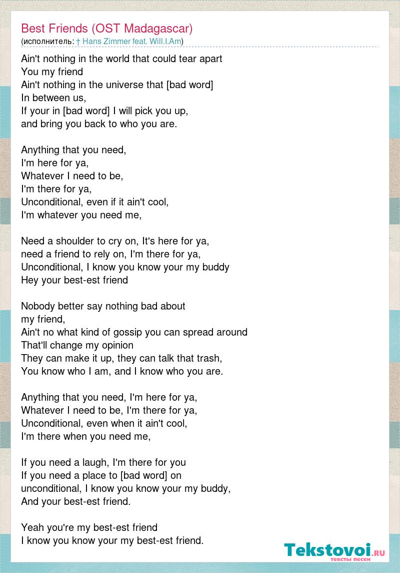 Ain't nothing in the world that could tear apart You my friend Ain't nothing in the universe that could come, In between us, If your in a rut I will pick you up, and bring you back to who you are. Anything that you need, I'm here for ya, Whatever I need to be, I'm there for ya, Unconditional, even if it ain't cool, I'm whatever you need me, Need a shoulder to cry on, It's here for ya, need a friend to rely on, I'm there for ya, Unconditional, I know you know your my buddy Hey your best-est friend Nobody better say nothing bad about my friend, Ain't no what kind of gossip you can spread around That'll change my opinion They can make it up, they can talk that trash, You know who I am, and I know who you are. Anything that you need, I'm here for ya, Whatever I need to be, I'm there for ya, Unconditional, even when it ain't cool, I'm there when you need me, If you need a laugh, I'm there for you If you need a place to crash, come on unconditional, I know you know your my buddy, And your best-est friend. Yeah you're my best-est friend I know you know your my best-est friend.