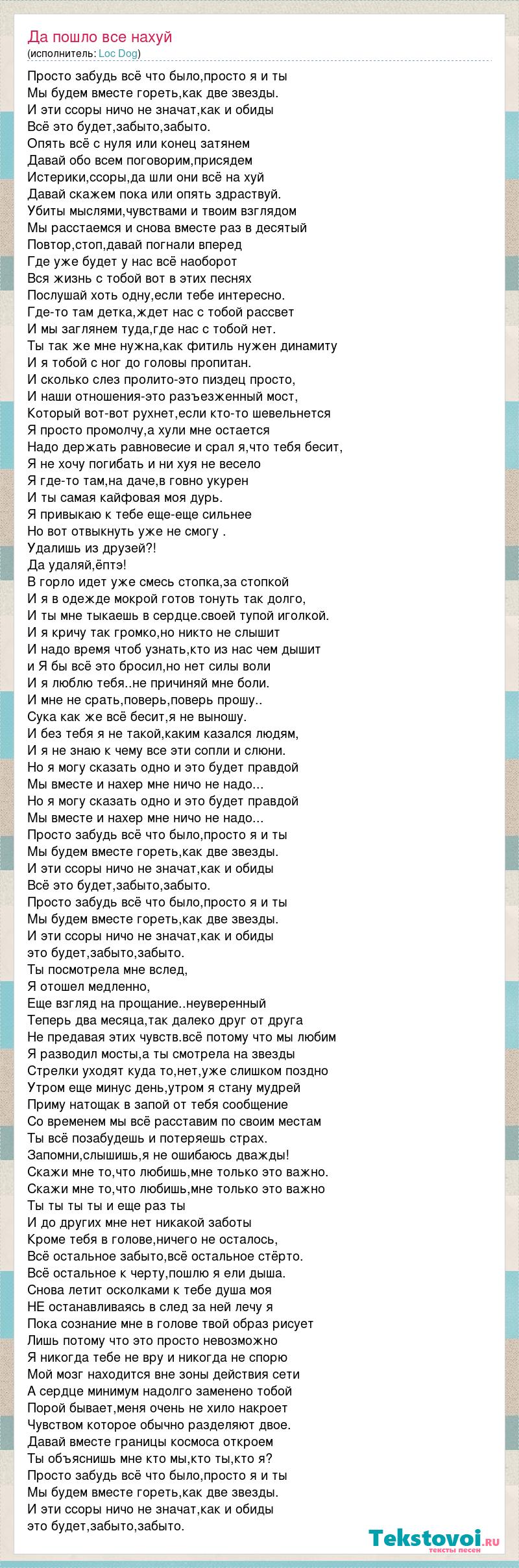 Просто забудь всё что было,просто я и ты Мы будем вместе гореть,как две звезды. И эти ссоры ничо не значат,как и обиды Всё это будет,забыто,забыто. Опять всё с нуля или конец затянем Давай обо всем поговорим,присядем Истерики,ссоры,да шли они всё на хуй Давай скажем пока или опять здраствуй. Убиты мыслями,чувствами и твоим взглядом Мы расстаемся и снова вместе раз в десятый Повтор,стоп,давай погнали вперед Где уже будет у нас всё наоборот Вся жизнь с тобой вот в этих песнях Послушай хоть одну,если тебе интересно. Где-то там детка,ждет нас с тобой рассвет И мы заглянем туда,где нас с тобой нет. Ты так же мне нужна,как фитиль нужен динамиту И я тобой с ног до головы пропитан. И сколько слез пролито-это пиздец просто, И наши отношения-это разъезженный мост, Который вот-вот рухнет,если кто-то шевельнется Я просто промолчу,а хули мне остается Надо держать равновесие и срал я,что тебя бесит, Я не хочу погибать и ни хуя не весело Я где-то там,на даче,в говно укурен И ты самая кайфовая моя дурь. Я привыкаю к тебе еще-еще сильнее Но вот отвыкнуть уже не смогу . Удалишь из друзей?! Да удаляй,ёптэ! В горло идет уже смесь стопка,за стопкой И я в одежде мокрой готов тонуть так долго, И ты мне тыкаешь в сердце.своей тупой иголкой. И я кричу так громко,но никто не слышит И надо время чтоб узнать,кто из нас чем дышит и Я бы всё это бросил,но нет силы воли И я люблю тебя..не причиняй мне боли. И мне не срать,поверь,поверь прошу.. Сука как же всё бесит,я не выношу. И без тебя я не такой,каким казался людям, И я не знаю к чему все эти сопли и слюни. Но я могу сказать одно и это будет правдой Мы вместе и нахер мне ничо не надо... Но я могу сказать одно и это будет правдой Мы вместе и нахер мне ничо не надо... Просто забудь всё что было,просто я и ты Мы будем вместе гореть,как две звезды. И эти ссоры ничо не значат,как и обиды Всё это будет,забыто,забыто. Просто забудь всё что было,просто я и ты Мы будем вместе гореть,как две звезды. И эти ссоры ничо не значат,как и обиды это будет,забыто,забыто. Ты посмотрела мне вслед, Я отошел медленно, Еще взгляд на прощание..неуверенный Теперь два месяца,так далеко друг от друга Не предавая этих чувств.всё потому что мы любим Я разводил мосты,а ты смотрела на звезды Стрелки уходят куда то,нет,уже слишком поздно Утром еще минус день,утром я стану мудрей Приму натощак в запой от тебя сообщение Со временем мы всё расставим по своим местам Ты всё позабудешь и потеряешь страх. Запомни,слышишь,я не ошибаюсь дважды! Скажи мне то,что любишь,мне только это важно. Скажи мне то,что любишь,мне только это важно Ты ты ты ты и еще раз ты И до других мне нет никакой заботы Кроме тебя в голове,ничего не осталось, Всё остальное забыто,всё остальное стёрто. Всё остальное к черту,пошлю я ели дыша. Снова летит осколками к тебе душа моя НЕ останавливаясь в след за ней лечу я Пока сознание мне в голове твой образ рисует Лишь потому что это просто невозможно Я никогда тебе не вру и никогда не спорю Мой мозг находится вне зоны действия сети А сердце минимум надолго заменено тобой Порой бывает,меня очень не хило накроет Чувством которое обычно разделяют двое. Давай вместе границы космоса откроем Ты объяснишь мне кто мы,кто ты,кто я? Просто забудь всё что было,просто я и ты Мы будем вместе гореть,как две звезды. И эти ссоры ничо не значат,как и обиды это будет,забыто,забыто.