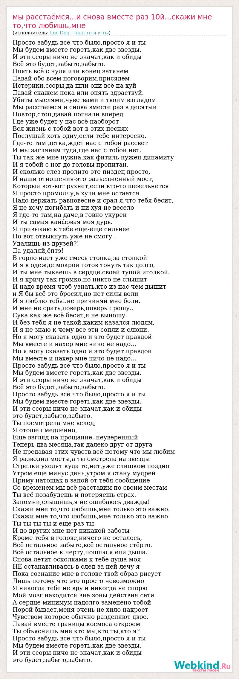 Просто забудь всё что было,просто я и ты Мы будем вместе гореть,как две звезды. И эти ссоры ничо не значат,как и обиды Всё это будет,забыто,забыто. Опять всё с нуля или конец затянем Давай обо всем поговорим,присядем Истерики,ссоры,да шли они всё на хуй Давай скажем пока или опять здраствуй. Убиты мыслями,чувствами и твоим взглядом Мы расстаемся и снова вместе раз в десятый Повтор,стоп,давай погнали вперед Где уже будет у нас всё наоборот Вся жизнь с тобой вот в этих песнях Послушай хоть одну,если тебе интересно. Где-то там детка,ждет нас с тобой рассвет И мы заглянем туда,где нас с тобой нет. Ты так же мне нужна,как фитиль нужен динамиту И я тобой с ног до головы пропитан. И сколько слез пролито-это пиздец просто, И наши отношения-это разъезженный мост, Который вот-вот рухнет,если кто-то шевельнется Я просто промолчу,а хули мне остается Надо держать равновесие и срал я,что тебя бесит, Я не хочу погибать и ни хуя не весело Я где-то там,на даче,в говно укурен И ты самая кайфовая моя дурь. Я привыкаю к тебе еще-еще сильнее Но вот отвыкнуть уже не смогу . Удалишь из друзей?! Да удаляй,ёптэ! В горло идет уже смесь стопка,за стопкой И я в одежде мокрой готов тонуть так долго, И ты мне тыкаешь в сердце.своей тупой иголкой. И я кричу так громко,но никто не слышит И надо время чтоб узнать,кто из нас чем дышит и Я бы всё это бросил,но нет силы воли И я люблю тебя..не причиняй мне боли. И мне не срать,поверь,поверь прошу.. Сука как же всё бесит,я не выношу. И без тебя я не такой,каким казался людям, И я не знаю к чему все эти сопли и слюни. Но я могу сказать одно и это будет правдой Мы вместе и нахер мне ничо не надо... Но я могу сказать одно и это будет правдой Мы вместе и нахер мне ничо не надо... Просто забудь всё что было,просто я и ты Мы будем вместе гореть,как две звезды. И эти ссоры ничо не значат,как и обиды Всё это будет,забыто,забыто. Просто забудь всё что было,просто я и ты Мы будем вместе гореть,как две звезды. И эти ссоры ничо не значат,как и обиды это будет,забыто,забыто. Ты посмотрела мне вслед, Я отошел медленно, Еще взгляд на прощание..неуверенный Теперь два месяца,так далеко друг от друга Не предавая этих чувств.всё потому что мы любим Я разводил мосты,а ты смотрела на звезды Стрелки уходят куда то,нет,уже слишком поздно Утром еще минус день,утром я стану мудрей Приму натощак в запой от тебя сообщение Со временем мы всё расставим по своим местам Ты всё позабудешь и потеряешь страх. Запомни,слышишь,я не ошибаюсь дважды! Скажи мне то,что любишь,мне только это важно. Скажи мне то,что любишь,мне только это важно Ты ты ты ты и еще раз ты И до других мне нет никакой заботы Кроме тебя в голове,ничего не осталось, Всё остальное забыто,всё остальное стёрто. Всё остальное к черту,пошлю я ели дыша. Снова летит осколками к тебе душа моя НЕ останавливаясь в след за ней лечу я Пока сознание мне в голове твой образ рисует Лишь потому что это просто невозможно Я никогда тебе не вру и никогда не спорю Мой мозг находится вне зоны действия сети А сердце минимум надолго заменено тобой Порой бывает,меня очень не хило накроет Чувством которое обычно разделяют двое. Давай вместе границы космоса откроем Ты объяснишь мне кто мы,кто ты,кто я? Просто забудь всё что было,просто я и ты Мы будем вместе гореть,как две звезды. И эти ссоры ничо не значат,как и обиды это будет,забыто,забыто.