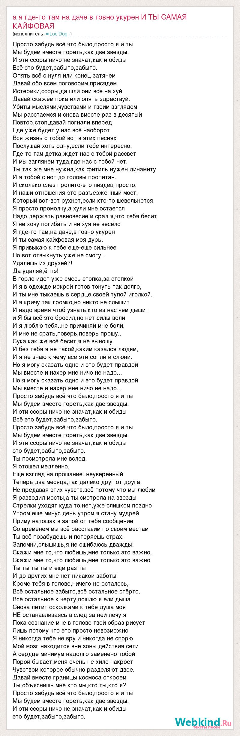 Просто забудь всё что было,просто я и ты Мы будем вместе гореть,как две звезды. И эти ссоры ничо не значат,как и обиды Всё это будет,забыто,забыто. Опять всё с нуля или конец затянем Давай обо всем поговорим,присядем Истерики,ссоры,да шли они всё на хуй Давай скажем пока или опять здраствуй. Убиты мыслями,чувствами и твоим взглядом Мы расстаемся и снова вместе раз в десятый Повтор,стоп,давай погнали вперед Где уже будет у нас всё наоборот Вся жизнь с тобой вот в этих песнях Послушай хоть одну,если тебе интересно. Где-то там детка,ждет нас с тобой рассвет И мы заглянем туда,где нас с тобой нет. Ты так же мне нужна,как фитиль нужен динамиту И я тобой с ног до головы пропитан. И сколько слез пролито-это пиздец просто, И наши отношения-это разъезженный мост, Который вот-вот рухнет,если кто-то шевельнется Я просто промолчу,а хули мне остается Надо держать равновесие и срал я,что тебя бесит, Я не хочу погибать и ни хуя не весело Я где-то там,на даче,в говно укурен И ты самая кайфовая моя дурь. Я привыкаю к тебе еще-еще сильнее Но вот отвыкнуть уже не смогу . Удалишь из друзей?! Да удаляй,ёптэ! В горло идет уже смесь стопка,за стопкой И я в одежде мокрой готов тонуть так долго, И ты мне тыкаешь в сердце.своей тупой иголкой. И я кричу так громко,но никто не слышит И надо время чтоб узнать,кто из нас чем дышит и Я бы всё это бросил,но нет силы воли И я люблю тебя..не причиняй мне боли. И мне не срать,поверь,поверь прошу.. Сука как же всё бесит,я не выношу. И без тебя я не такой,каким казался людям, И я не знаю к чему все эти сопли и слюни. Но я могу сказать одно и это будет правдой Мы вместе и нахер мне ничо не надо... Но я могу сказать одно и это будет правдой Мы вместе и нахер мне ничо не надо... Просто забудь всё что было,просто я и ты Мы будем вместе гореть,как две звезды. И эти ссоры ничо не значат,как и обиды Всё это будет,забыто,забыто. Просто забудь всё что было,просто я и ты Мы будем вместе гореть,как две звезды. И эти ссоры ничо не значат,как и обиды это будет,забыто,забыто. Ты посмотрела мне вслед, Я отошел медленно, Еще взгляд на прощание..неуверенный Теперь два месяца,так далеко друг от друга Не предавая этих чувств.всё потому что мы любим Я разводил мосты,а ты смотрела на звезды Стрелки уходят куда то,нет,уже слишком поздно Утром еще минус день,утром я стану мудрей Приму натощак в запой от тебя сообщение Со временем мы всё расставим по своим местам Ты всё позабудешь и потеряешь страх. Запомни,слышишь,я не ошибаюсь дважды! Скажи мне то,что любишь,мне только это важно. Скажи мне то,что любишь,мне только это важно Ты ты ты ты и еще раз ты И до других мне нет никакой заботы Кроме тебя в голове,ничего не осталось, Всё остальное забыто,всё остальное стёрто. Всё остальное к черту,пошлю я ели дыша. Снова летит осколками к тебе душа моя НЕ останавливаясь в след за ней лечу я Пока сознание мне в голове твой образ рисует Лишь потому что это просто невозможно Я никогда тебе не вру и никогда не спорю Мой мозг находится вне зоны действия сети А сердце минимум надолго заменено тобой Порой бывает,меня очень не хило накроет Чувством которое обычно разделяют двое. Давай вместе границы космоса откроем Ты объяснишь мне кто мы,кто ты,кто я? Просто забудь всё что было,просто я и ты Мы будем вместе гореть,как две звезды. И эти ссоры ничо не значат,как и обиды это будет,забыто,забыто.