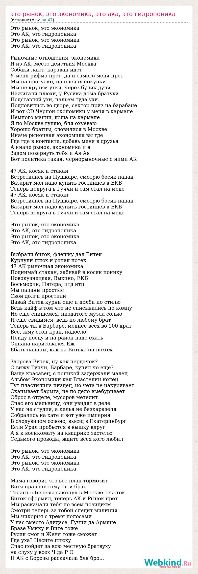 Это рынок, это экономика Это АК, это гидропоника Это рынок, это экономика Это АК, это гидропоника Рыночные отношения, экономика Я из АК, место действия Москва Собаки лают, караван идет У меня рифма прет, да и самого меня прет Мы на прогулке, на плечах покупки Мы не крутим утки, через булик дули Нажигали плюхи, у Русика дома братухи Подставляй ухи, нальем туда ухи. Подловились во дворе, сектор приз на барабане И вот CD Черной экономики у меня в кармане Немного мании, кэша на кармане Я по Москве гуляю, бля охуеваю Хорошо братцы, словилися в Москве Иначе рыночная экономика вы где Где где в контакте, добавь меня в друзья А иначе рынок, экономика и я Задом повернуть тебя и Ая Ая Вот политика такая, чернорыночные с ними АК 47 АК, косяк и стакан Встретились на Пушкаре, смотрю босяк пацан Базарит мол надо купить гостинцев в ЕКБ Теперь подруга в Гуччи и сам стал на моде 47 АК, косяк и стакан Встретились на Пушкаре, смотрю босяк пацан Базарит мол надо купить гостинцев в ЕКБ Теперь подруга в Гуччи и сам стал на моде Это рынок, это экономика Это АК, это гидропоника Это рынок, это экономика Это АК, это гидропоника Выбрали биток, флешку дал Витек Курнули плюх и рэпак потек 47 АК рыночная экономика Поднимай стакан, забивай в косяк понику Новокузнецкая, Выхино, ЕКБ Восьмерик, Пятера, итд итп Мы пацаны простые Свои долги простили Давай Витек курни еще и долби по стилю Ведь кайф в том что не списывались по компу Но еще спишемся, пиздатого музла солью И еще свидимся, ведь по любому брат Теперь ты в Барбаре, моднее всех во 100 крат Все, жму стоп-кран, надоело Пойду посцу и на район надо ехать Оппана нарисовался Еж Ебать пацаны, как на Витька он похож Здорова Витек, ну как чердачок? О вижу Гуччи, Барбаре, купил чо еще? Ваще красавец, с поникой задержали малец Альбом Экономики как Властелин колец Тут пластилина пиздец, но чета не накуривает Сканывает барыга, не по дело выебуривает Оброс в отделе, мусоров метелит Счас его мельницу, они увидят в деле У нас не студия, а келья не безкаразеля Собрались на хате и вот уже империя В следующем сезоне, выезд в Екатеринбург Если Урал пробьется в вышку вдруг А я к военкомату на квадрике застелю Седьмого проводы, ждите всех кого любил Это рынок, это экономика Это АК, это гидропоника Это рынок, это экономика Это АК, это гидропоника Мама говорит это все план тормозит Витя прав поэтому он и брат Талант с Березы накинул в Москве тексток Биток оформил, теперь АК и Рынок прет Мы раскачали тебя по всем позициям Смотри теперь за тобой следит милиция Мы чикорня с тремя полосами У нас вместо Адидаса, Гуччи да Армяне Бразе Умику и Вите тоже Русик смог и Женя тоже сможет Где уха? Несите плюху Счас пойдет за всю местную братвуху на слуху у всех Ч да Р О И АК с Березы раскачала бля бро...