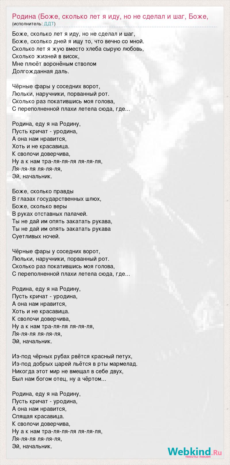 Боже, сколько лет я иду, но не сделал и шаг, Боже, сколько дней я ищу то, что вечно со мной. Сколько лет я жую вместо хлеба сырую любовь, Сколько жизней в висок, Мне плюёт воронёным стволом Долгожданная даль. Чёрные фары у соседних ворот, Люльки, наручники, порванный рот. Сколько раз покатившись моя голова, С переполненной плахи летела сюда, где... Родина, еду я на Родину, Пусть кричат - уродина, А она нам нравится, Хоть и не красавица. К сволочи доверчива, Ну а к нам тра-ля-ля-ля ля-ля-ля, Ля-ля-ля ля-ля-ля, Эй, начальник. Боже, сколько правды В глазах государственных шлюх, Боже, сколько веры В руках отставных палачей. Ты не дай им опять закатать рукава, Ты не дай им опять закатать рукава Суетливых ночей. Чёрные фары у соседних ворот, Люльки, наручники, порванный рот. Сколько раз покатившись моя голова, С переполненной плахи летела сюда, где... Родина, еду я на Родину, Пусть кричат - уродина, А она нам нравится, Хоть и не красавица. К сволочи доверчива, Ну а к нам тра-ля-ля ля-ля-ля, Ля-ля-ля ля-ля-ля, Эй, начальник. Из-под чёрных рубах рвётся красный петух, Из-под добрых царей льётся в рты мармелад. Никогда этот мир не вмещал в себе двух, Был нам богом отец, ну а чёртом... Родина, еду я на Родину, Пусть кричат - уродина, А она нам нравится, Спящая красавица. К сволочи доверчива, Ну а к нам тра-ля-ля-ля ля-ля-ля, Ля-ля-ля ля-ля-ля, Эй, начальник.