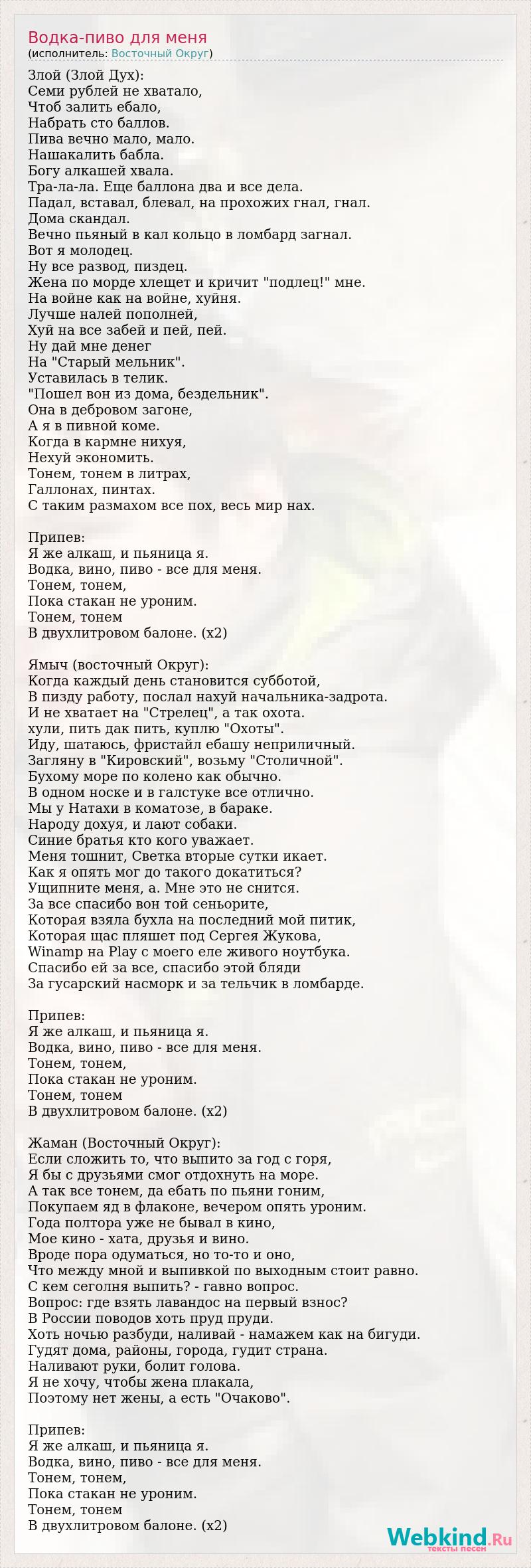 Злой (Злой Дух): Семи рублей не хватало, Чтоб залить ебало, Набрать сто баллов. Пива вечно мало, мало. Нашакалить бабла. Богу алкашей хвала. Тра-ла-ла. Еще баллона два и все дела. Падал, вставал, блевал, на прохожих гнал, гнал. Дома скандал. Вечно пьяный в кал кольцо в ломбард загнал. Вот я молодец. Ну все развод, пиздец. Жена по морде хлещет и кричит "подлец!" мне. На войне как на войне, хуйня. Лучше налей пополней, Хуй на все забей и пей, пей. Ну дай мне денег На "Старый мельник". Уставилась в телик. "Пошел вон из дома, бездельник". Она в дебровом загоне, А я в пивной коме. Когда в кармне нихуя, Нехуй экономить. Тонем, тонем в литрах, Галлонах, пинтах. С таким размахом все пох, весь мир нах. Припев: Я же алкаш, и пьяница я. Водка, вино, пиво - все для меня. Тонем, тонем, Пока стакан не уроним. Тонем, тонем В двухлитровом балоне. (x2) Ямыч (восточный Округ): Когда каждый день становится субботой, В пизду работу, послал нахуй начальника-задрота. И не хватает на "Стрелец", а так охота. хули, пить дак пить, куплю "Охоты". Иду, шатаюсь, фристайл ебашу неприличный. Загляну в "Кировский", возьму "Столичной". Бухому море по колено как обычно. В одном носке и в галстуке все отлично. Мы у Натахи в коматозе, в бараке. Народу дохуя, и лают собаки. Синие братья кто кого уважает. Меня тошнит, Светка вторые сутки икает. Как я опять мог до такого докатиться? Ущипните меня, а. Мне это не снится. За все спасибо вон той сеньорите, Которая взяла бухла на последний мой питик, Которая щас пляшет под Сергея Жукова, Winamp на Play с моего еле живого ноутбука. Спасибо ей за все, спасибо этой бляди За гусарский насморк и за тельчик в ломбарде. Припев: Я же алкаш, и пьяница я. Водка, вино, пиво - все для меня. Тонем, тонем, Пока стакан не уроним. Тонем, тонем В двухлитровом балоне. (x2) Жаман (Восточный Округ): Если сложить то, что выпито за год с горя, Я бы с друзьями смог отдохнуть на море. А так все тонем, да ебать по пьяни гоним, Покупаем яд в флаконе, вечером опять уроним. Года полтора уже не бывал в кино, Мое кино - хата, друзья и вино. Вроде пора одуматься, но то-то и оно, Что между мной и выпивкой по выходным стоит равно. С кем сеголня выпить? - гавно вопрос. Вопрос: где взять лавандос на первый взнос? В России поводов хоть пруд пруди. Хоть ночью разбуди, наливай - намажем как на бигуди. Гудят дома, районы, города, гудит страна. Наливают руки, болит голова. Я не хочу, чтобы жена плакала, Поэтому нет жены, а есть "Очаково". Припев: Я же алкаш, и пьяница я. Водка, вино, пиво - все для меня. Тонем, тонем, Пока стакан не уроним. Тонем, тонем В двухлитровом балоне. (x2)