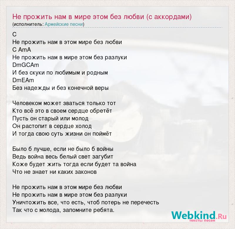 С Не прожить нам в этом мире без любви С AmA Не прожить нам в мире этом без разлуки DmGCAm И без скуки по любимым и родным DmEAm Без надежды и без конечной веры Человеком может зваться только тот Кто всё это в своем сердце обретёт Пусть он старый или молод Он растопит в сердце холод И тогда свою суть жизни он поймёт Было б лучше, если не было б войны Ведь война весь белый свет загубит Коже будет жить тогда если будет та война Что не знает ни каких законов Не прожить нам в этом мире без любви Не прожить нам в мире этом без разлуки Уничтожить все, что есть, чтоб потерь не перечесть Так что с молода, запомните ребята.