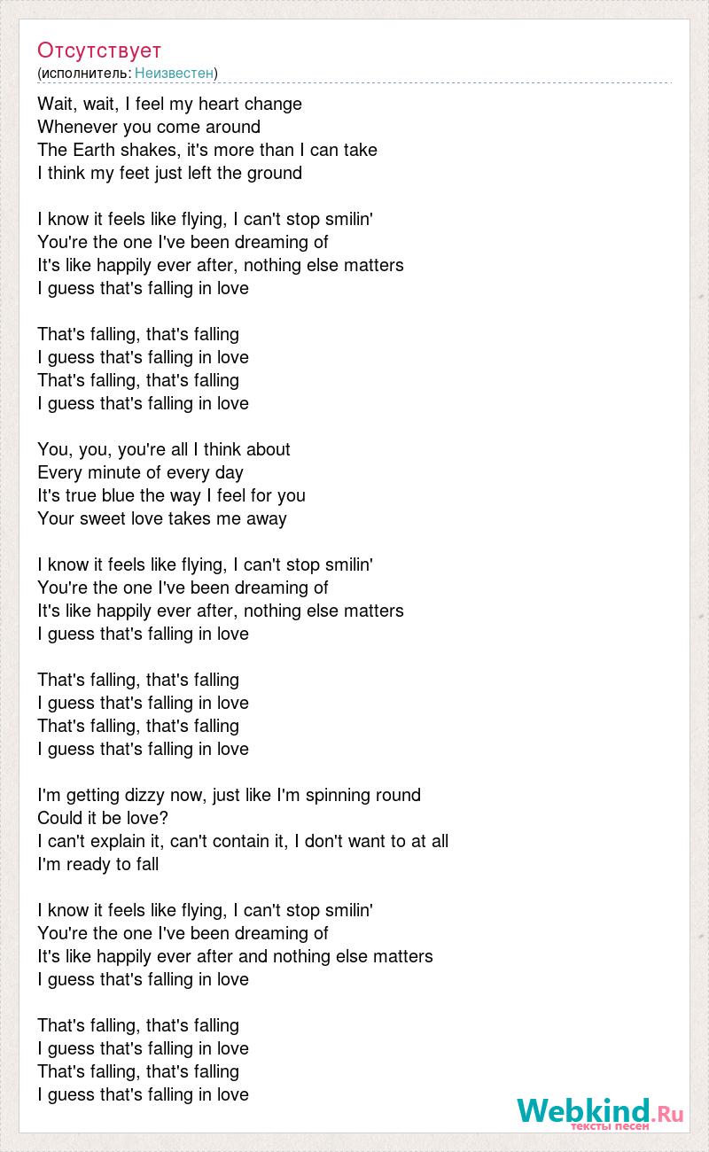 Wait, wait, I feel my heart change Whenever you come around The Earth shakes, it's more than I can take I think my feet just left the ground I know it feels like flying, I can't stop smilin' You're the one I've been dreaming of It's like happily ever after, nothing else matters I guess that's falling in love That's falling, that's falling I guess that's falling in love That's falling, that's falling I guess that's falling in love You, you, you're all I think about Every minute of every day It's true blue the way I feel for you Your sweet love takes me away I know it feels like flying, I can't stop smilin' You're the one I've been dreaming of It's like happily ever after, nothing else matters I guess that's falling in love That's falling, that's falling I guess that's falling in love That's falling, that's falling I guess that's falling in love I'm getting dizzy now, just like I'm spinning round Could it be love? I can't explain it, can't contain it, I don't want to at all I'm ready to fall I know it feels like flying, I can't stop smilin' You're the one I've been dreaming of It's like happily ever after and nothing else matters I guess that's falling in love That's falling, that's falling I guess that's falling in love That's falling, that's falling I guess that's falling in love
