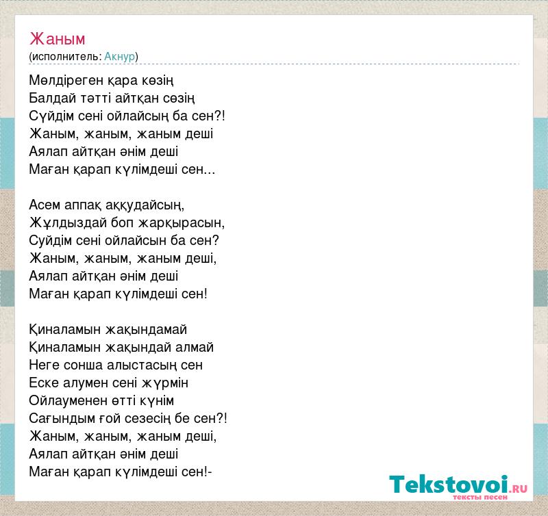 Мөлдіреген қара көзің Балдай тәтті айтқан сөзің Сүйдім сені ойлайсың ба сен?! Жаным, жаным, жаным деші Аялап айтқан әнім деші Маған қарап күлімдеші сен... Асем аппақ аққудайсың, Жұлдыздай боп жарқырасын, Суйдiм сенi ойлайсын ба сен? Жаным, жаным, жаным деші, Аялап айтқан әнім деші Маған қарап күлімдеші сен! Қиналамын жақындамай Қиналамын жақындай алмай Неге сонша алыстасың сен Еске алумен сені жүрмін Ойлауменен өтті күнім Сағындым ғой сезесің бе сен?! Жаным, жаным, жаным деші, Аялап айтқан әнім деші Маған қарап күлімдеші сен!-