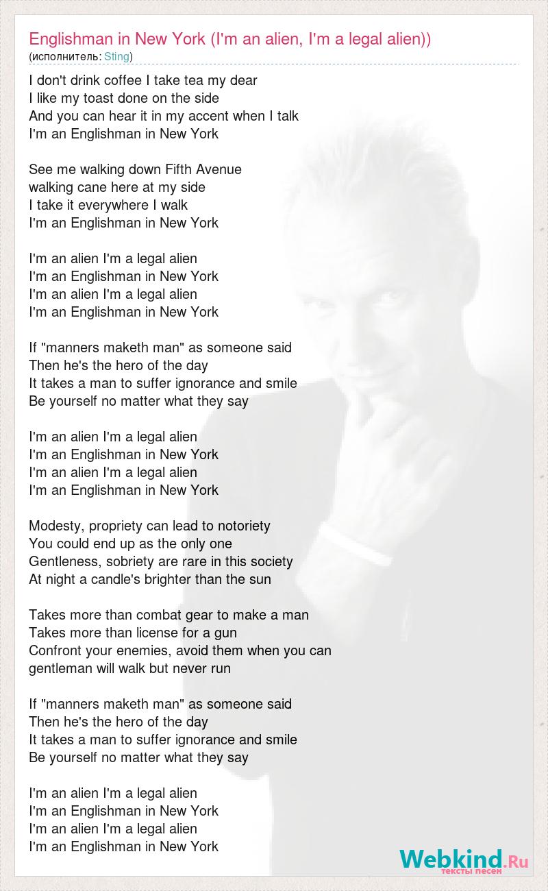 I don't drink coffee I take tea my dear I like my toast done on the side And you can hear it in my accent when I talk I'm an Englishman in New York See me walking down Fifth Avenue walking cane here at my side I take it everywhere I walk I'm an Englishman in New York I'm an alien I'm a legal alien I'm an Englishman in New York I'm an alien I'm a legal alien I'm an Englishman in New York If "manners maketh man" as someone said Then he's the hero of the day It takes a man to suffer ignorance and smile Be yourself no matter what they say I'm an alien I'm a legal alien I'm an Englishman in New York I'm an alien I'm a legal alien I'm an Englishman in New York Modesty, propriety can lead to notoriety You could end up as the only one Gentleness, sobriety are rare in this society At night a candle's brighter than the sun Takes more than combat gear to make a man Takes more than license for a gun Confront your enemies, avoid them when you can gentleman will walk but never run If "manners maketh man" as someone said Then he's the hero of the day It takes a man to suffer ignorance and smile Be yourself no matter what they say I'm an alien I'm a legal alien I'm an Englishman in New York I'm an alien I'm a legal alien I'm an Englishman in New York