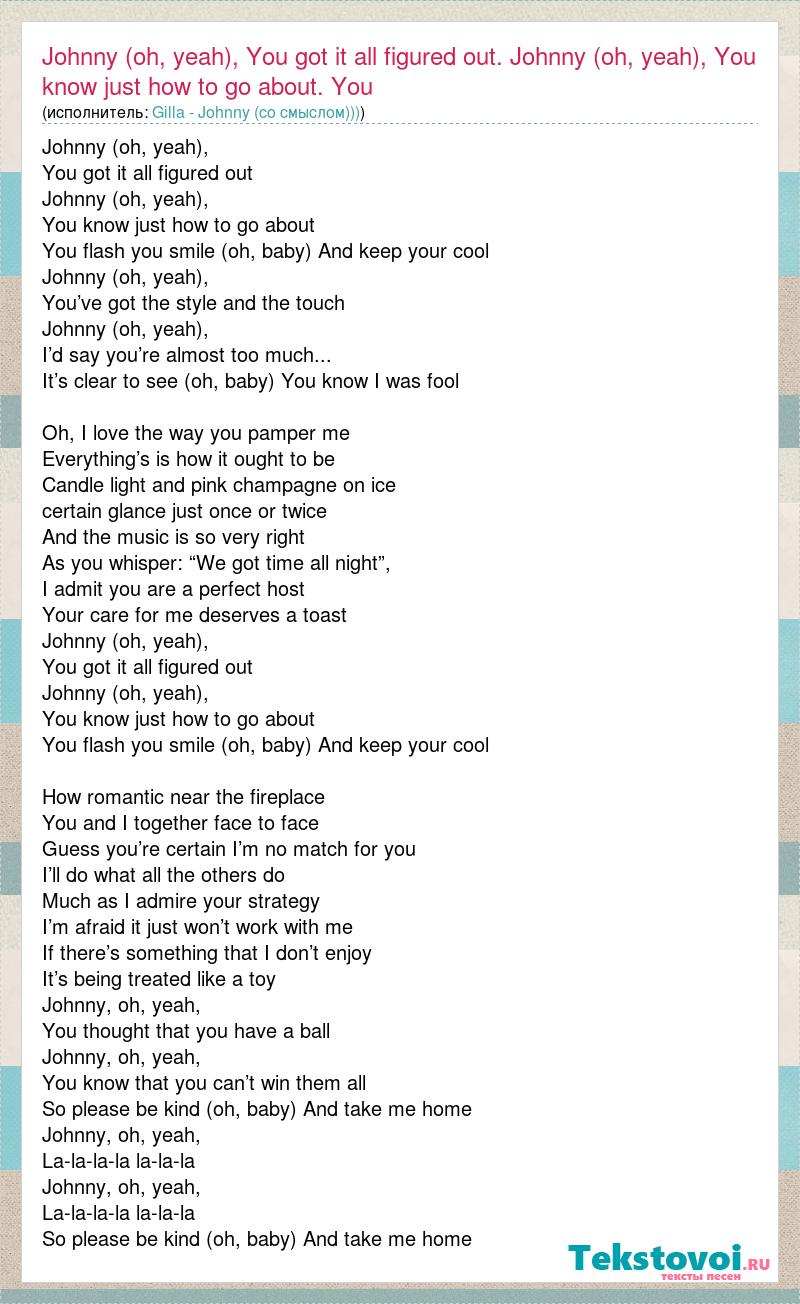 Главная→Исполнители→Gilla - Johnny (со смыслом)))→Johnny (oh, yeah), You got it all figured out. Johnny (oh, yeah), You know