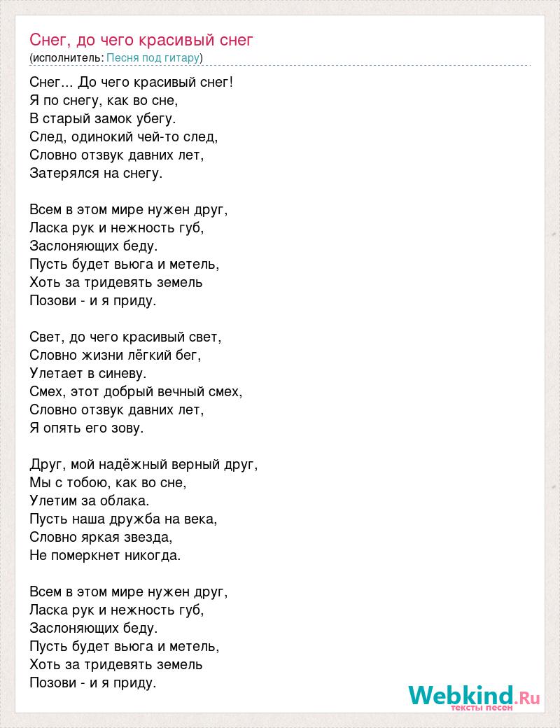 Снег... До чего красивый снег! Я по снегу, как во сне, В старый замок убегу. След, одинокий чей-то след, Словно отзвук давних лет, Затерялся на снегу. Всем в этом мире нужен друг, Ласка рук и нежность губ, Заслоняющих беду. Пусть будет вьюга и метель, Хоть за тридевять земель Позови - и я приду. Свет, до чего красивый свет, Словно жизни лёгкий бег, Улетает в синеву. Смех, этот добрый вечный смех, Словно отзвук давних лет, Я опять его зову. Друг, мой надёжный верный друг, Мы с тобою, как во сне, Улетим за облака. Пусть наша дружба на века, Словно яркая звезда, Не померкнет никогда. Всем в этом мире нужен друг, Ласка рук и нежность губ, Заслоняющих беду. Пусть будет вьюга и метель, Хоть за тридевять земель Позови - и я приду.