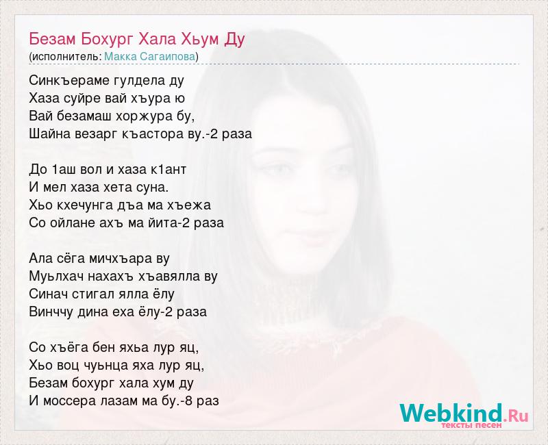 Синкъераме гулдела ду Хаза суйре вай хъура ю Вай безамаш хоржура бу, Шайна везарг къастора ву.-2 раза До 1аш вол и хаза к1ант И мел хаза хета суна. Хьо кхечунга дъа ма хъежа Со ойлане ахъ ма йита-2 раза Ала сёга мичхъара ву Муьлхач нахахъ хъавялла ву Синач стигал ялла ёлу Винччу дина еха ёлу-2 раза Со хъёга бен яхьа лур яц, Хьо воц чуьнца яха лур яц, Безам бохург хала хум ду И моссера лазам ма бу.-8 раз