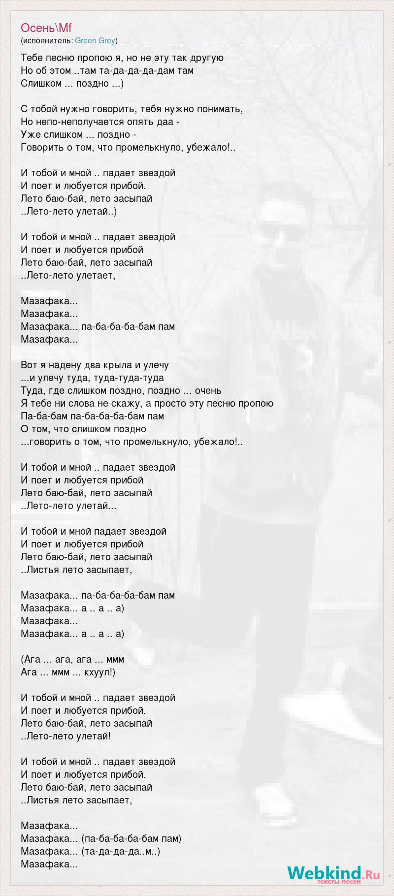 Тебе песню пропою я, но не эту так другую Но об этом ..там та-да-да-да-дам там Слишком ... поздно ...) С тобой нужно говорить, тебя нужно понимать, Но непо-неполучается опять даа - Уже слишком ... поздно - Говорить о том, что промелькнуло, убежало!.. И тобой и мной .. падает звездой И поет и любуется прибой. Лето баю-бай, лето засыпай ..Лето-лето улетай..) И тобой и мной .. падает звездой И поет и любуется прибой Лето баю-бай, лето засыпай ..Лето-лето улетает, Мазафака... Мазафака... Мазафака... па-ба-ба-ба-бам пам Мазафака... Вот я надену два крыла и улечу ...и улечу туда, туда-туда-туда Туда, где слишком поздно, поздно ... очень Я тебе ни слова не скажу, а просто эту песню пропою Па-ба-бам па-ба-ба-ба-бам пам О том, что слишком поздно ...говорить о том, что промелькнуло, убежало!.. И тобой и мной .. падает звездой И поет и любуется прибой Лето баю-бай, лето засыпай ..Лето-лето улетай... И тобой и мной падает звездой И поет и любуется прибой Лето баю-бай, лето засыпай ..Листья лето засыпает, Мазафака... па-ба-ба-ба-бам пам Мазафака... а .. а .. а) Мазафака... Мазафака... а .. а .. а) (Ага ... ага, ага ... ммм Ага ... ммм ... кхуул!) И тобой и мной .. падает звездой И поет и любуется прибой. Лето баю-бай, лето засыпай ..Лето-лето улетай! И тобой и мной .. падает звездой И поет и любуется прибой. Лето баю-бай, лето засыпай ..Листья лето засыпает, Мазафака... Мазафака... (па-ба-ба-ба-бам пам) Мазафака... (та-да-да-да..м..) Мазафака...