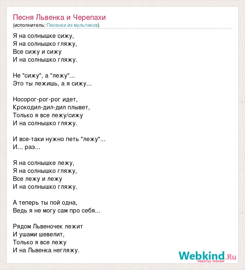 Я на солнышке сижу, Я на солнышко гляжу, Все сижу и сижу И на солнышко гляжу. Не "сижу", а "лежу"... Это ты лежишь, а я сижу... Носорог-рог-рог идет, Крокодил-дил-дил плывет, Только я все лежу/сижу И на солнышко гляжу. И все-таки нужно петь "лежу"... И... раз... Я на солнышке лежу, Я на солнышко гляжу, Все лежу и лежу И на солнышко гляжу. А теперь ты пой одна, Ведь я не могу сам про себя... Рядом Львеночек лежит И ушами шевелит, Только я все лежу И на Львенка негляжу.