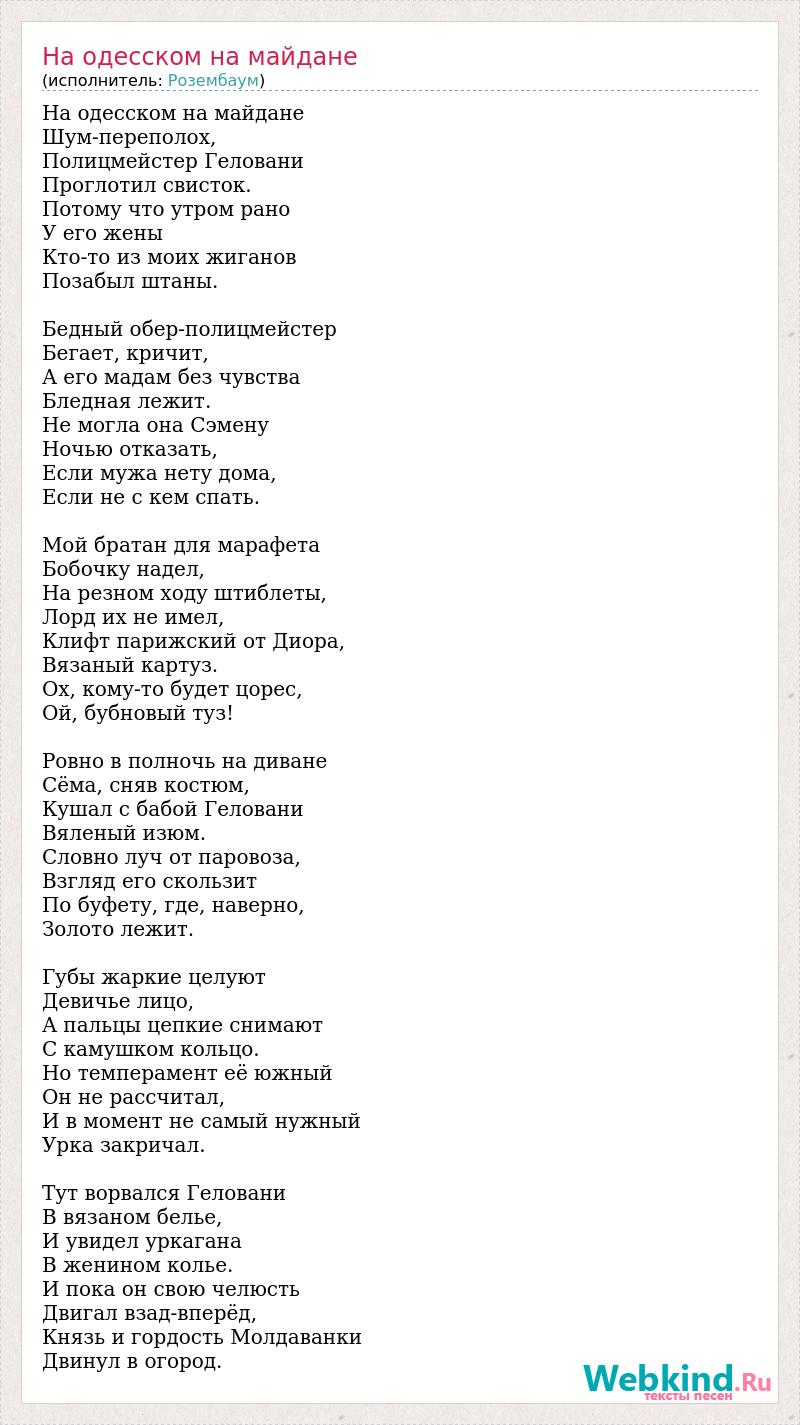 На одесском на майдане Шум-переполох, Полицмейстер Геловани Проглотил свисток. Потому что утром рано У его жены Кто-то из моих жиганов Позабыл штаны. Бедный обер-полицмейстер Бегает, кричит, А его мадам без чувства Бледная лежит. Не могла она Сэмену Ночью отказать, Если мужа нету дома, Если не с кем спать. Мой братан для марафета Бобочку надел, На резном ходу штиблеты, Лорд их не имел, Клифт парижский от Диора, Вязаный картуз. Ох, кому-то будет цорес, Ой, бубновый туз! Ровно в полночь на диване Сёма, сняв костюм, Кушал с бабой Геловани Вяленый изюм. Словно луч от паровоза, Взгляд его скользит По буфету, где, наверно, Золото лежит. Губы жаркие целуют Девичье лицо, А пальцы цепкие снимают С камушком кольцо. Но темперамент её южный Он не рассчитал, И в момент не самый нужный Урка закричал. Тут ворвался Геловани В вязаном белье, И увидел уркагана В женином колье. И пока он свою челюсть Двигал взад-вперёд, Князь и гордость Молдаванки Двинул в огород.
