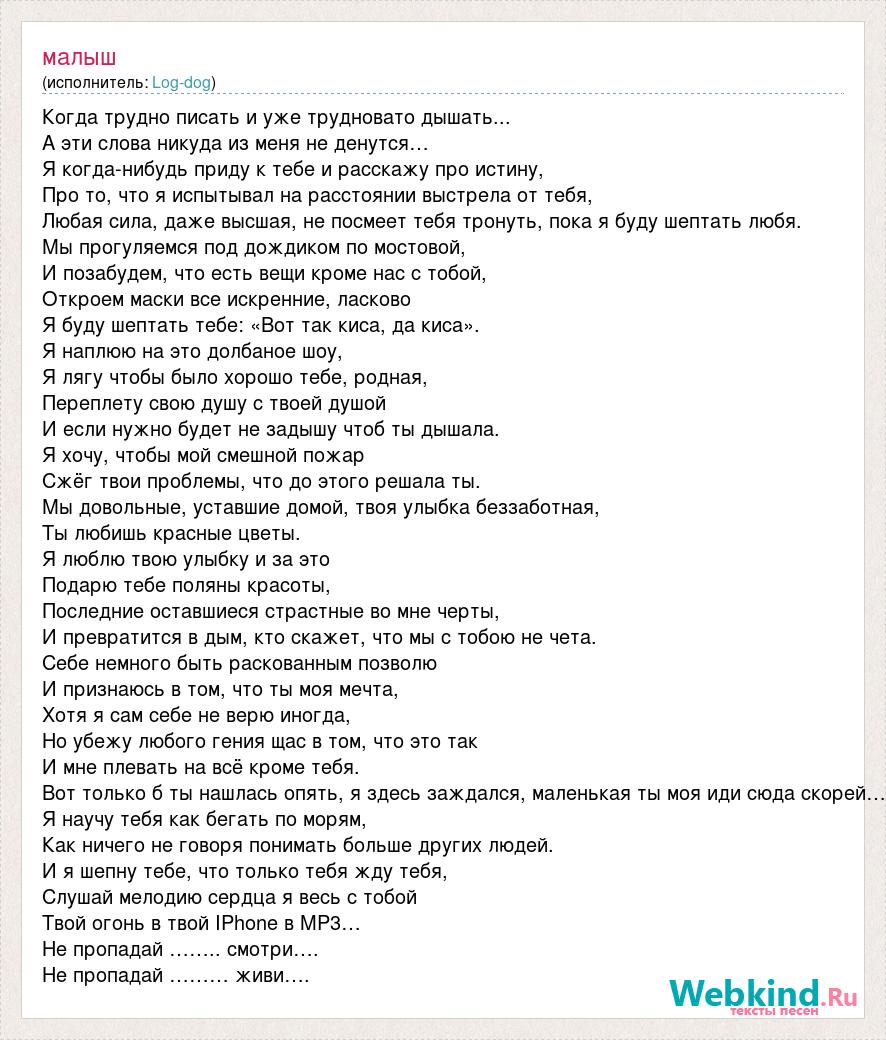 Когда трудно писать и уже трудновато дышать... А эти слова никуда из меня не денутся… Я когда-нибудь приду к тебе и расскажу про истину, Про то, что я испытывал на расстоянии выстрела от тебя, Любая сила, даже высшая, не посмеет тебя тронуть, пока я буду шептать любя. Мы прогуляемся под дождиком по мостовой, И позабудем, что есть вещи кроме нас с тобой, Откроем маски все искренние, ласково Я буду шептать тебе: «Вот так киса, да киса». Я наплюю на это долбаное шоу, Я лягу чтобы было хорошо тебе, родная, Переплету свою душу с твоей душой И если нужно будет не задышу чтоб ты дышала. Я хочу, чтобы мой смешной пожар Сжёг твои проблемы, что до этого решала ты. Мы довольные, уставшие домой, твоя улыбка беззаботная, Ты любишь красные цветы. Я люблю твою улыбку и за это Подарю тебе поляны красоты, Последние оставшиеся страстные во мне черты, И превратится в дым, кто скажет, что мы с тобою не чета. Себе немного быть раскованным позволю И признаюсь в том, что ты моя мечта, Хотя я сам себе не верю иногда, Но убежу любого гения щас в том, что это так И мне плевать на всё кроме тебя. Вот только б ты нашлась опять, я здесь заждался, маленькая ты моя иди сюда скорей… Я научу тебя как бегать по морям, Как ничего не говоря понимать больше других людей. И я шепну тебе, что только тебя жду тебя, Слушай мелодию сердца я весь с тобой Твой огонь в твой IPhone в MP3… Не пропадай …….. смотри…. Не пропадай ……… живи….