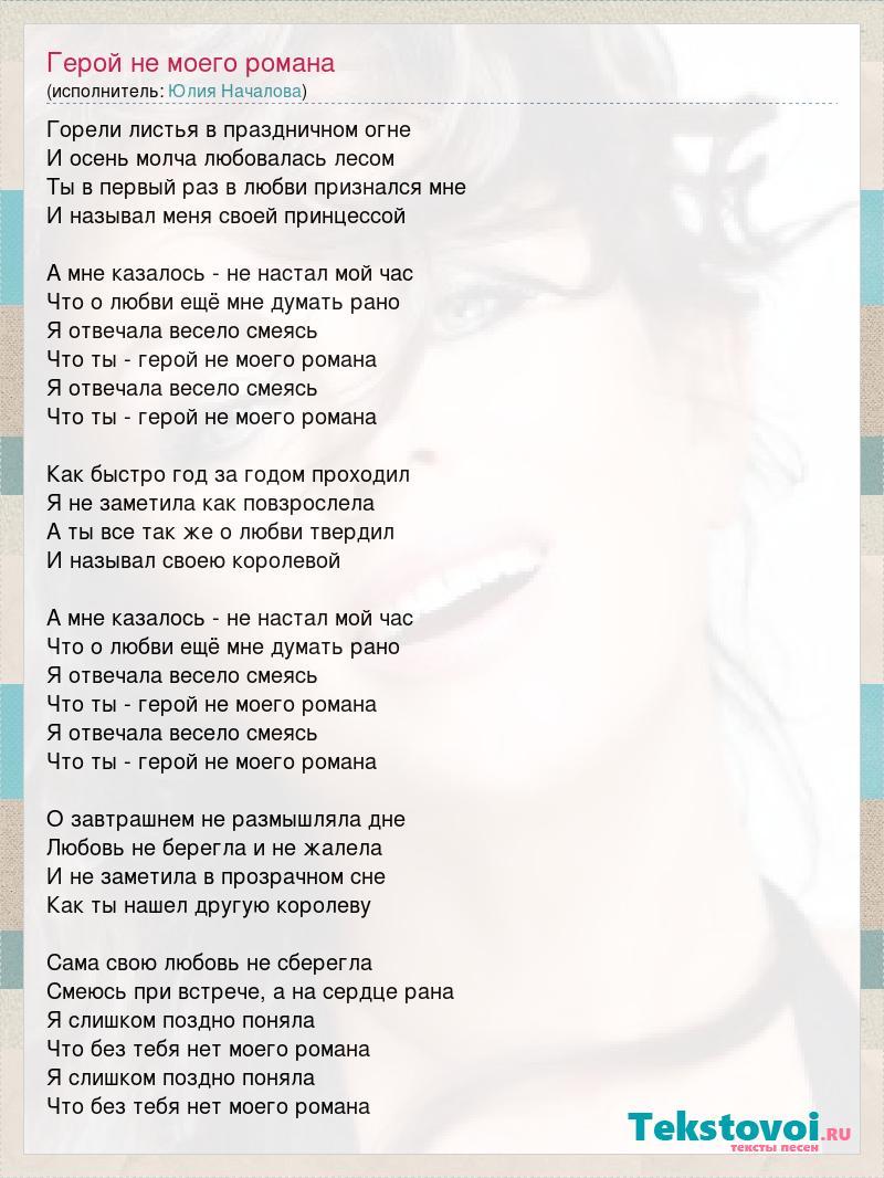 Горели листья в праздничном огне И осень молча любовалась лесом Ты в первый раз в любви признался мне И называл меня своей принцессой А мне казалось - не настал мой час Что о любви ещё мне думать рано Я отвечала весело смеясь Что ты - герой не моего романа Я отвечала весело смеясь Что ты - герой не моего романа Как быстро год за годом проходил Я не заметила как повзрослела А ты все так же о любви твердил И называл своею королевой А мне казалось - не настал мой час Что о любви ещё мне думать рано Я отвечала весело смеясь Что ты - герой не моего романа Я отвечала весело смеясь Что ты - герой не моего романа О завтрашнем не размышляла дне Любовь не берегла и не жалела И не заметила в прозрачном сне Как ты нашел другую королеву Сама свою любовь не сберегла Смеюсь при встрече, а на сердце рана Я слишком поздно поняла Что без тебя нет моего романа Я слишком поздно поняла Что без тебя нет моего романа