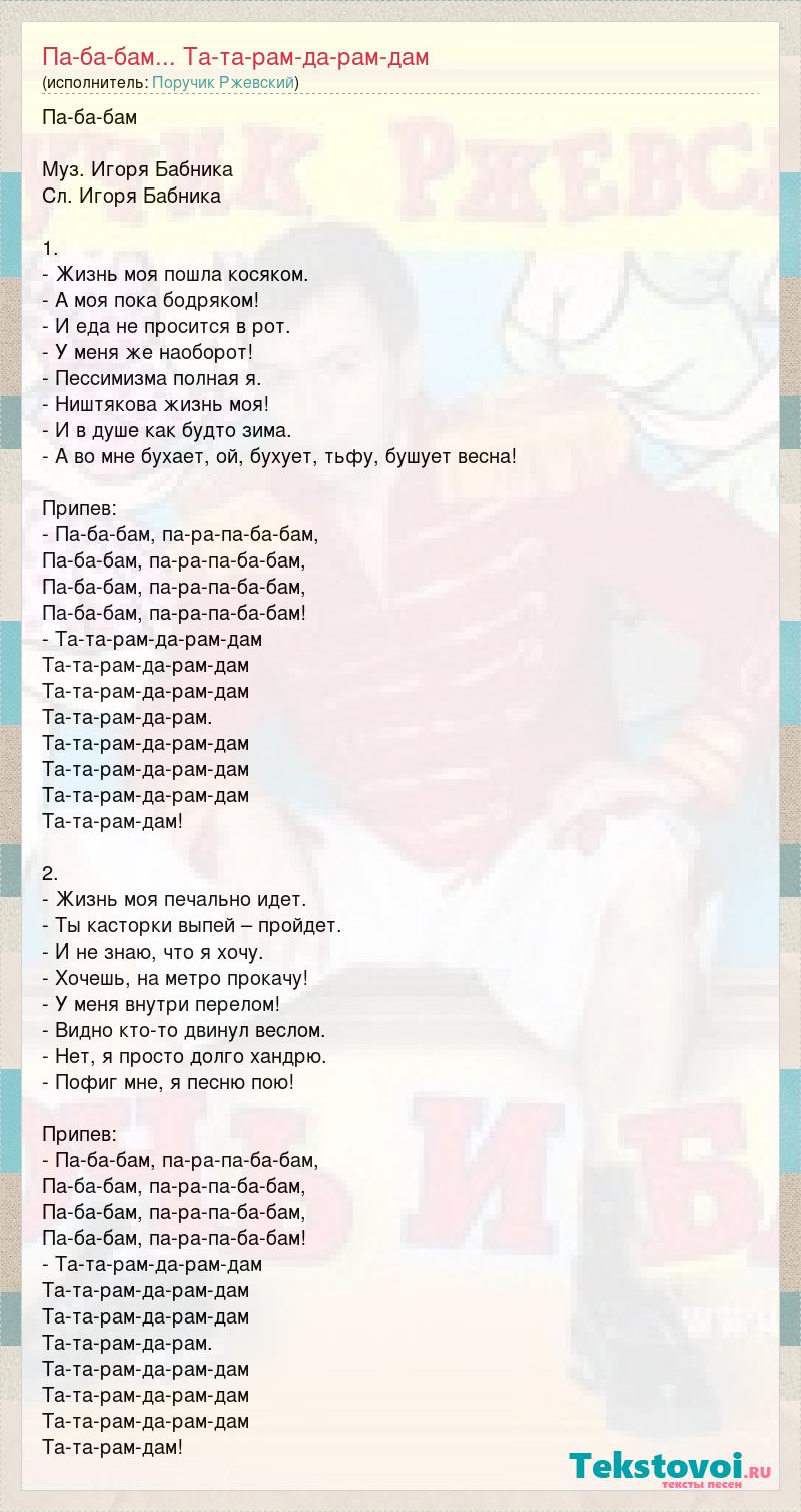 Па-ба-бам Муз. Игоря Бабника Сл. Игоря Бабника 1. - Жизнь моя пошла косяком. - А моя пока бодряком! - И еда не просится в рот. - У меня же наоборот! - Пессимизма полная я. - Ништякова жизнь моя! - И в душе как будто зима. - А во мне бухает, ой, бухует, тьфу, бушует весна! Припев: - Па-ба-бам, па-ра-па-ба-бам, Па-ба-бам, па-ра-па-ба-бам, Па-ба-бам, па-ра-па-ба-бам, Па-ба-бам, па-ра-па-ба-бам! - Та-та-рам-да-рам-дам Та-та-рам-да-рам-дам Та-та-рам-да-рам-дам Та-та-рам-да-рам. Та-та-рам-да-рам-дам Та-та-рам-да-рам-дам Та-та-рам-да-рам-дам Та-та-рам-дам! 2. - Жизнь моя печально идет. - Ты касторки выпей – пройдет. - И не знаю, что я хочу. - Хочешь, на метро прокачу! - У меня внутри перелом! - Видно кто-то двинул веслом. - Нет, я просто долго хандрю. - Пофиг мне, я песню пою! Припев: - Па-ба-бам, па-ра-па-ба-бам, Па-ба-бам, па-ра-па-ба-бам, Па-ба-бам, па-ра-па-ба-бам, Па-ба-бам, па-ра-па-ба-бам! - Та-та-рам-да-рам-дам Та-та-рам-да-рам-дам Та-та-рам-да-рам-дам Та-та-рам-да-рам. Та-та-рам-да-рам-дам Та-та-рам-да-рам-дам Та-та-рам-да-рам-дам Та-та-рам-дам!