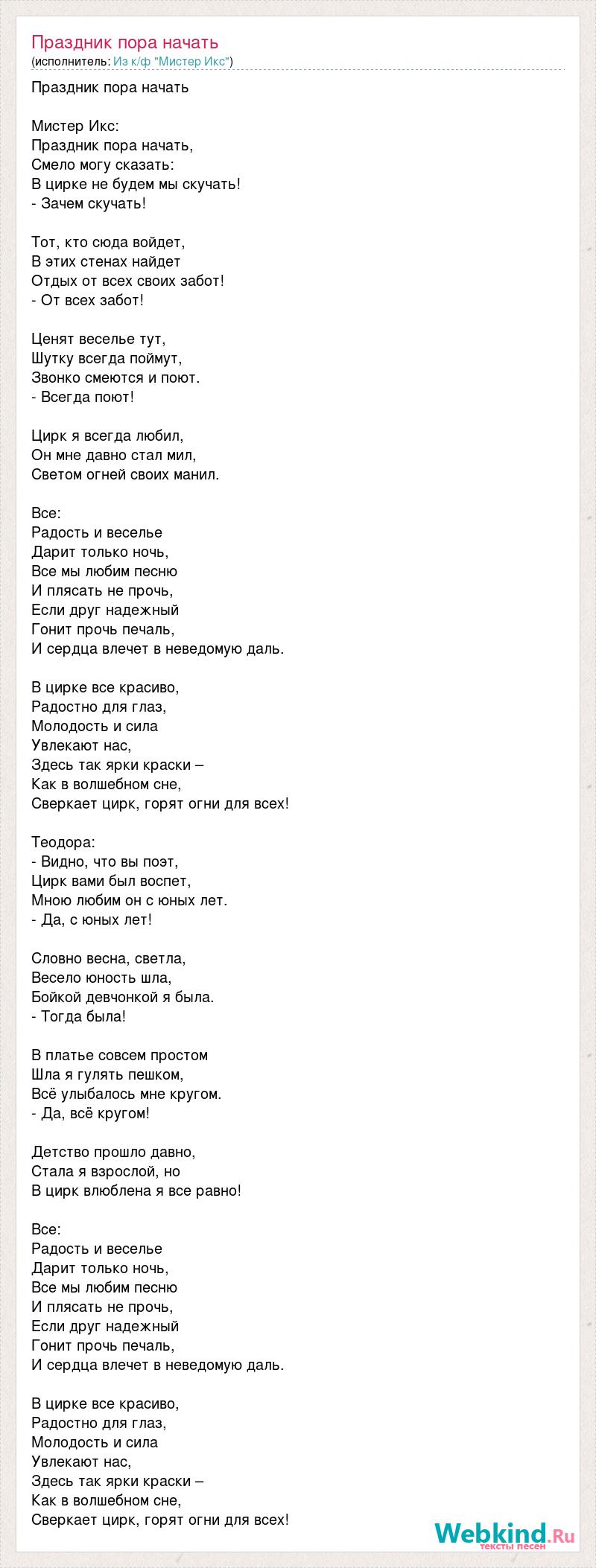 Праздник пора начать Мистер Икс: Праздник пора начать, Смело могу сказать: В цирке не будем мы скучать! - Зачем скучать! Тот, кто сюда войдет, В этих стенах найдет Отдых от всех своих забот! - От всех забот! Ценят веселье тут, Шутку всегда поймут, Звонко смеются и поют. - Всегда поют! Цирк я всегда любил, Он мне давно стал мил, Светом огней своих манил. Все: Радость и веселье Дарит только ночь, Все мы любим песню И плясать не прочь, Если друг надежный Гонит прочь печаль, И сердца влечет в неведомую даль. В цирке все красиво, Радостно для глаз, Молодость и сила Увлекают нас, Здесь так ярки краски – Как в волшебном сне, Сверкает цирк, горят огни для всех! Теодора: - Видно, что вы поэт, Цирк вами был воспет, Мною любим он с юных лет. - Да, с юных лет! Словно весна, светла, Весело юность шла, Бойкой девчонкой я была. - Тогда была! В платье совсем простом Шла я гулять пешком, Всё улыбалось мне кругом. - Да, всё кругом! Детство прошло давно, Стала я взрослой, но В цирк влюблена я все равно! Все: Радость и веселье Дарит только ночь, Все мы любим песню И плясать не прочь, Если друг надежный Гонит прочь печаль, И сердца влечет в неведомую даль. В цирке все красиво, Радостно для глаз, Молодость и сила Увлекают нас, Здесь так ярки краски – Как в волшебном сне, Сверкает цирк, горят огни для всех!