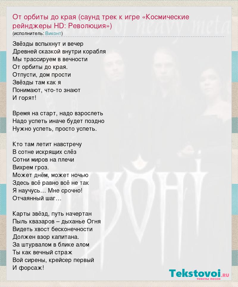Звёзды вспыхнут и вечер Древней сказкой внутри корабля Мы трассируем в вечности От орбиты до края. Отпусти, дом прости Звёзды там как я Понимают, что-то знают И горят! Время на старт, надо взрослеть Надо успеть иначе будет поздно Нужно успеть, просто успеть. Кто там летит навстречу В сотне искрящих слёз Сотни миров на плечи Вихрем гроз. Может днём, может ночью Здесь всё равно всё не так Я научусь… Мне срочно! Отчаянный шаг… Карты звёзд, путь начертан Пыль квазаров – дыханье Огня Видеть хвост бесконечности Должен взор капитана. За штурвалом в блике алом Ты как вечный страж Вой сирены, крейсер первый И форсаж!