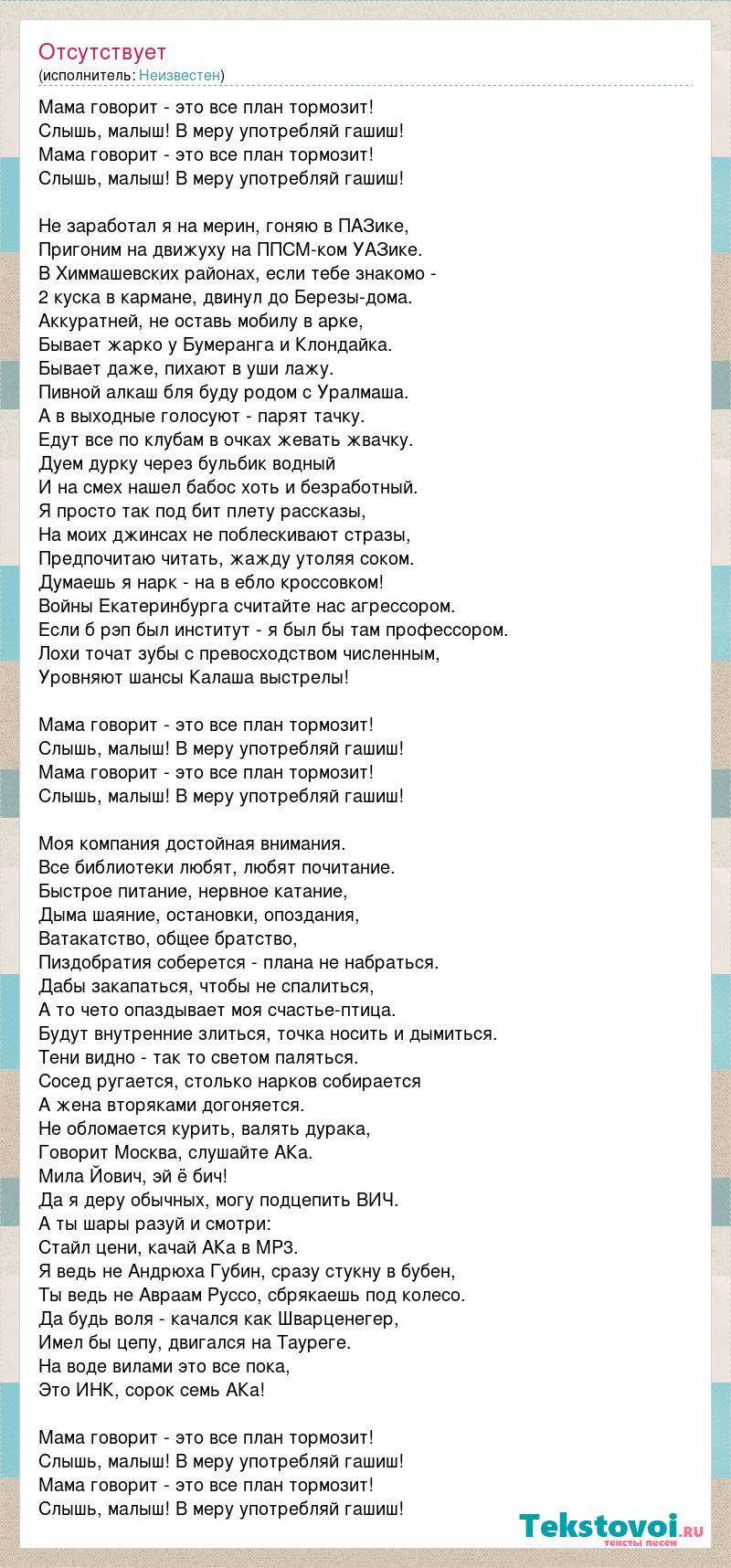 Мама говорит - это все план тормозит! Слышь, малыш! В меру употребляй гашиш! Мама говорит - это все план тормозит! Слышь, малыш! В меру употребляй гашиш! Не заработал я на мерин, гоняю в ПАЗике, Пригоним на движуху на ППСМ-ком УАЗике. В Химмашевских районах, если тебе знакомо - 2 куска в кармане, двинул до Березы-дома. Аккуратней, не оставь мобилу в арке, Бывает жарко у Бумеранга и Клондайка. Бывает даже, пихают в уши лажу. Пивной алкаш бля буду родом с Уралмаша. А в выходные голосуют - парят тачку. Едут все по клубам в очках жевать жвачку. Дуем дурку через бульбик водный И на смех нашел бабос хоть и безработный. Я просто так под бит плету рассказы, На моих джинсах не поблескивают стразы, Предпочитаю читать, жажду утоляя соком. Думаешь я нарк - на в ебло кроссовком! Войны Екатеринбурга считайте нас агрессором. Если б рэп был институт - я был бы там профессором. Лохи точат зубы с превосходством численным, Уровняют шансы Калаша выстрелы! Мама говорит - это все план тормозит! Слышь, малыш! В меру употребляй гашиш! Мама говорит - это все план тормозит! Слышь, малыш! В меру употребляй гашиш! Моя компания достойная внимания. Все библиотеки любят, любят почитание. Быстрое питание, нервное катание, Дыма шаяние, остановки, опоздания, Ватакатство, общее братство, Пиздобратия соберется - плана не набраться. Дабы закапаться, чтобы не спалиться, А то чето опаздывает моя счастье-птица. Будут внутренние злиться, точка носить и дымиться. Тени видно - так то светом паляться. Сосед ругается, столько нарков собирается А жена вторяками догоняется. Не обломается курить, валять дурака, Говорит Москва, слушайте АКа. Мила Йович, эй ё бич! Да я деру обычных, могу подцепить ВИЧ. А ты шары разуй и смотри: Стайл цени, качай АКа в MP3. Я ведь не Андрюха Губин, сразу стукну в бубен, Ты ведь не Авраам Руссо, сбрякаешь под колесо. Да будь воля - качался как Шварценегер, Имел бы цепу, двигался на Тауреге. На воде вилами это все пока, Это ИНК, сорок семь АКа! Мама говорит - это все план тормозит! Слышь, малыш! В меру употребляй гашиш! Мама говорит - это все план тормозит! Слышь, малыш! В меру употребляй гашиш!