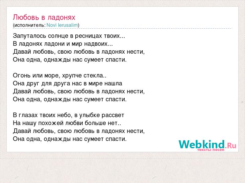 Запуталось солнце в ресницах твоих... В ладонях ладони и мир надвоих... Давай любовь, свою любовь в ладонях нести, Она одна, однажды нас сумеет спасти. Огонь или море, хрупче стекла.. Она друг для друга нас в мире нашла Давай любовь, свою любовь в ладонях нести, Она одна, однажды нас сумеет спасти. В глазах твоих небо, в улыбке рассвет На нашу похожей любви больше нет.. Давай любовь, свою любовь в ладонях нести, Она одна, однажды нас сумеет спасти.