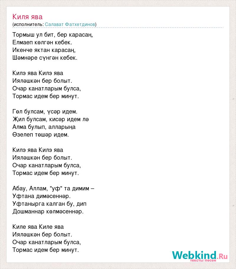 Тормыш ул бит, бер карасаң, Елмаеп көлгән кебек. Икенче яктан карасаң, Шәмнәре сүнгән кебек. Килэ ява Килэ ява Ияләшкән бер болыт. Очар канатларым булса, Тормас идем бер минут. Гөл булсам, үсәр идем. Җил булсам, кисәр идем лә Алма булып, алларыңа Өзелеп төшәр идем. Килэ ява Килэ ява Ияләшкән бер болыт. Очар канатларым булса, Тормас идем бер минут. Абау, Аллам, "уф" та димим – Уфтана димәсеннәр. Уфтанырга калган бу, дип Дошманнар көлмәсеннәр. Киле ява Киле ява Ияләшкән бер болыт. Очар канатларым булса, Тормас идем бер минут.