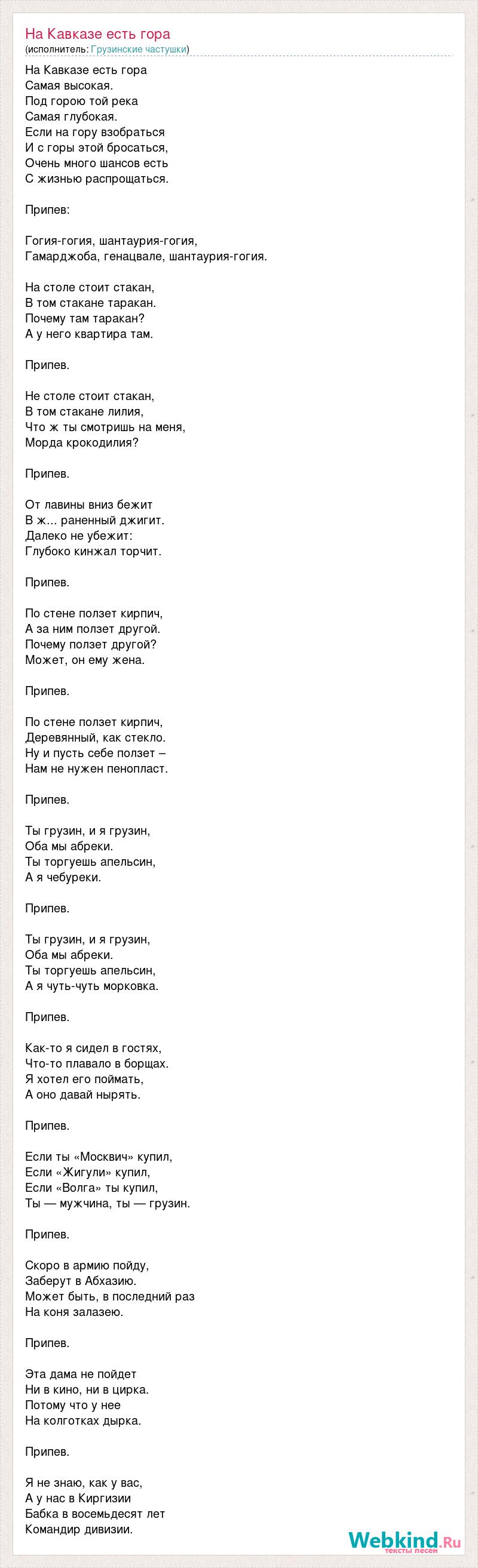 На Кавказе есть гора Самая высокая. Под горою той река Самая глубокая. Если на гору взобраться И с горы этой бросаться, Очень много шансов есть С жизнью распрощаться. Припев: Гогия-гогия, шантаурия-гогия, Гамарджоба, генацвале, шантаурия-гогия. На столе стоит стакан, В том стакане таракан. Почему там таракан? А у него квартира там. Припев. Не столе стоит стакан, В том стакане лилия, Что ж ты смотришь на меня, Морда крокодилия? Припев. От лавины вниз бежит В ж... раненный джигит. Далеко не убежит: Глубоко кинжал торчит. Припев. По стене ползет кирпич, А за ним ползет другой. Почему ползет другой? Может, он ему жена. Припев. По стене ползет кирпич, Деревянный, как стекло. Ну и пусть себе ползет – Нам не нужен пенопласт. Припев. Ты грузин, и я грузин, Оба мы абреки. Ты торгуешь апельсин, А я чебуреки. Припев. Ты грузин, и я грузин, Оба мы абреки. Ты торгуешь апельсин, А я чуть-чуть морковка. Припев. Как-то я сидел в гостях, Что-то плавало в борщах. Я хотел его поймать, А оно давай нырять. Припев. Если ты «Москвич» купил, Если «Жигули» купил, Если «Волга» ты купил, Ты — мужчина, ты — грузин. Припев. Скоро в армию пойду, Заберут в Абхазию. Может быть, в последний раз На коня залазею. Припев. Эта дама не пойдет Ни в кино, ни в цирка. Потому что у нее На колготках дырка. Припев. Я не знаю, как у вас, А у нас в Киргизии Бабка в восемьдесят лет Командир дивизии.