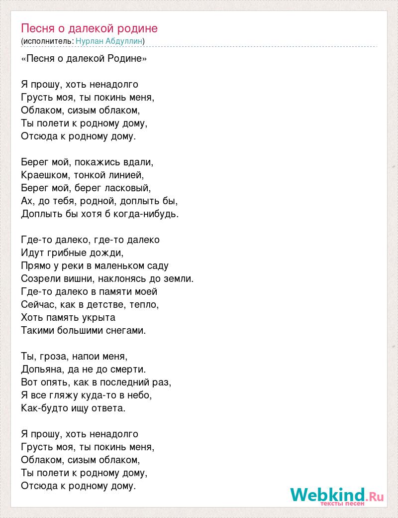 «Песня о далекой Родине» Я прошу, хоть ненадолго Грусть моя, ты покинь меня, Облаком, сизым облаком, Ты полети к родному дому, Отсюда к родному дому. Берег мой, покажись вдали, Краешком, тонкой линией, Берег мой, берег ласковый, Ах, до тебя, родной, доплыть бы, Доплыть бы хотя б когда-нибудь. Где-то далеко, где-то далеко Идут грибные дожди, Прямо у реки в маленьком саду Созрели вишни, наклонясь до земли. Где-то далеко в памяти моей Сейчас, как в детстве, тепло, Хоть память укрыта Такими большими снегами. Ты, гроза, напои меня, Допьяна, да не до смерти. Вот опять, как в последний раз, Я все гляжу куда-то в небо, Как-будто ищу ответа. Я прошу, хоть ненадолго Грусть моя, ты покинь меня, Облаком, сизым облаком, Ты полети к родному дому, Отсюда к родному дому.