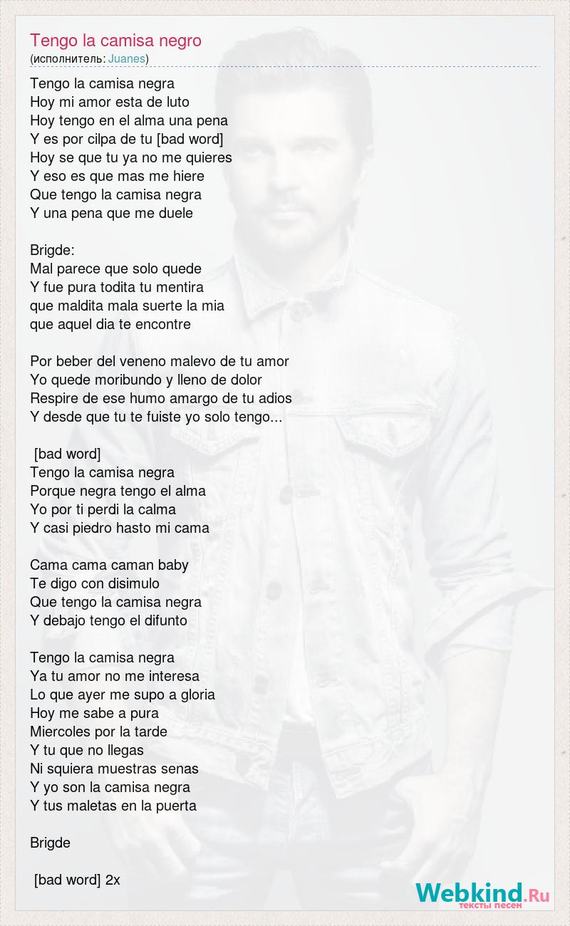 Tengo la camisa negra Hoy mi amor esta de luto Hoy tengo en el alma una pena Y es por cilpa de tu [bad word] Hoy se que tu ya no me quieres Y eso es que mas me hiere Que tengo la camisa negra Y una pena que me duele Brigde: Mal parece que solo quede Y fue pura todita tu mentira que maldita mala suerte la mia que aquel dia te encontre Por beber del veneno malevo de tu amor Yo quede moribundo y lleno de dolor Respire de ese humo amargo de tu adios Y desde que tu te fuiste yo solo tengo... [bad word] Tengo la camisa negra Porque negra tengo el alma Yo por ti perdi la calma Y casi piedro hasto mi cama Cama cama caman baby Te digo con disimulo Que tengo la camisa negra Y debajo tengo el difunto Tengo la camisa negra Ya tu amor no me interesa Lo que ayer me supo a gloria Hoy me sabe a pura Miercoles por la tarde Y tu que no llegas Ni squiera muestras senas Y yo son la camisa negra Y tus maletas en la puerta Brigde [bad word] 2x