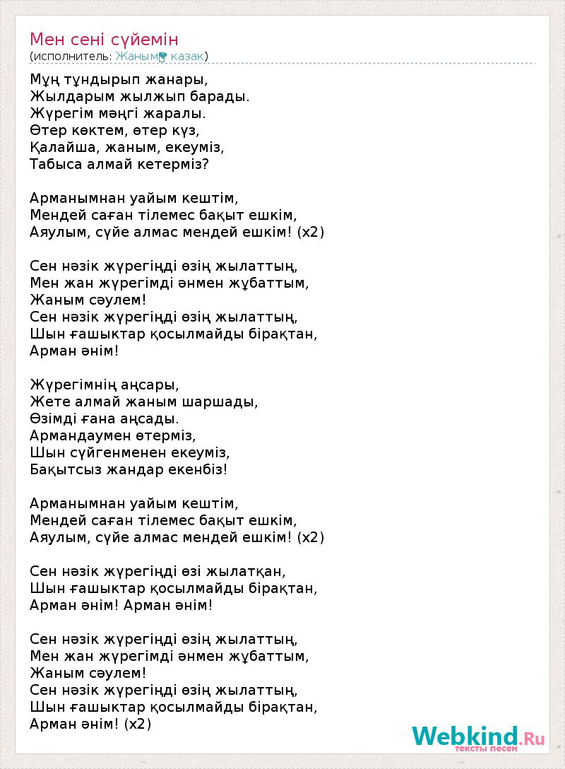 Мұң тұндырып жанары, Жылдарым жылжып барады. Жүрегім мәңгі жаралы. Өтер көктем, өтер күз, Қалайша, жаным, екеуміз, Табыса алмай кетерміз? Арманымнан уайым кештім, Мендей саған тілемес бақыт ешкім, Аяулым, сүйе алмас мендей ешкім! (х2) Сен нәзік жүрегіңді өзің жылаттың, Мен жан жүрегімді әнмен жұбаттым, Жаным сәулем! Сен нәзік жүрегіңді өзің жылаттың, Шын ғашыктар қосылмайды бірақтан, Арман әнім! Жүрегімнің аңсары, Жете алмай жаным шаршады, Өзімді ғана аңсады. Армандаумен өтерміз, Шын сүйгенменен екеуміз, Бақытсыз жандар екенбіз! Арманымнан уайым кештім, Мендей саған тілемес бақыт ешкім, Аяулым, сүйе алмас мендей ешкім! (х2) Сен нәзік жүрегіңді өзі жылатқан, Шын ғашыктар қосылмайды бірақтан, Арман әнім! Арман әнім! Сен нәзік жүрегіңді өзің жылаттың, Мен жан жүрегімді әнмен жұбаттым, Жаным сәулем! Сен нәзік жүрегіңді өзің жылаттың, Шын ғашыктар қосылмайды бірақтан, Арман әнім! (х2)