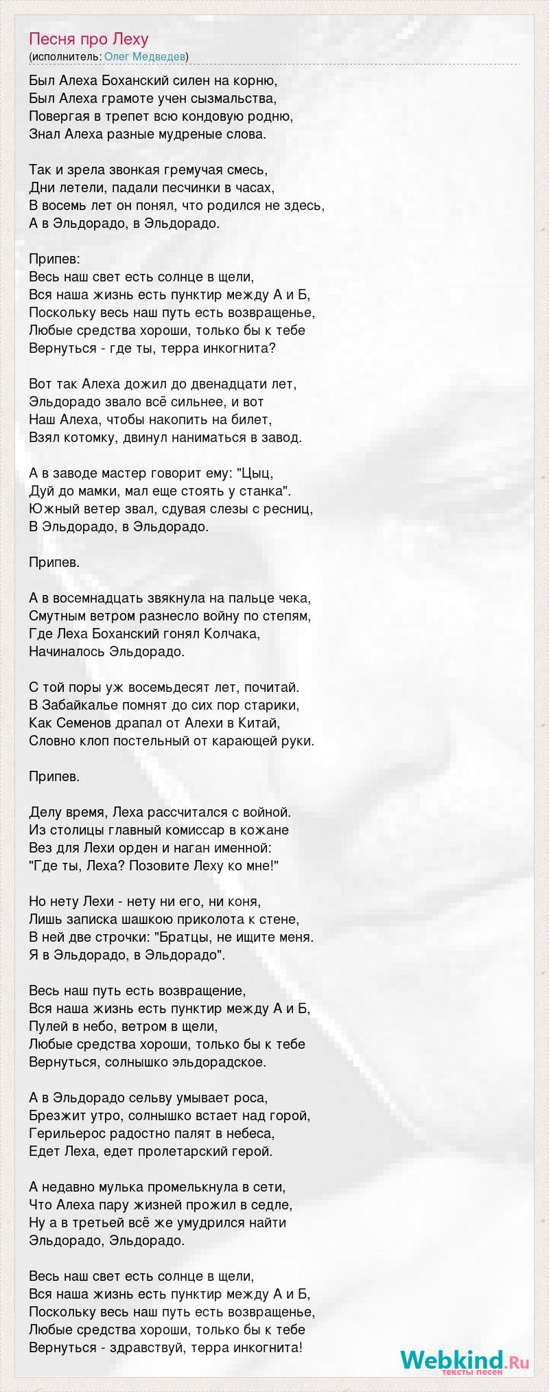 Был Алеха Боханский силен на корню, Был Алеха грамоте учен сызмальства, Повергая в трепет всю кондовую родню, Знал Алеха разные мудреные слова. Так и зрела звонкая гремучая смесь, Дни летели, падали песчинки в часах, В восемь лет он понял, что родился не здесь, А в Эльдорадо, в Эльдорадо. Припев: Весь наш свет есть солнце в щели, Вся наша жизнь есть пунктир между А и Б, Поскольку весь наш путь есть возвращенье, Любые средства хороши, только бы к тебе Вернуться - где ты, терра инкогнита? Вот так Алеха дожил до двенадцати лет, Эльдорадо звало всё сильнее, и вот Наш Алеха, чтобы накопить на билет, Взял котомку, двинул наниматься в завод. А в заводе мастер говорит ему: "Цыц, Дуй до мамки, мал еще стоять у станка". Южный ветер звал, сдувая слезы с ресниц, В Эльдорадо, в Эльдорадо. Припев. А в восемнадцать звякнула на пальце чека, Смутным ветром разнесло войну по степям, Где Леха Боханский гонял Колчака, Начиналось Эльдорадо. С той поры уж восемьдесят лет, почитай. В Забайкалье помнят до сих пор старики, Как Семенов драпал от Алехи в Китай, Словно клоп постельный от карающей руки. Припев. Делу время, Леха рассчитался с войной. Из столицы главный комиссар в кожане Вез для Лехи орден и наган именной: "Где ты, Леха? Позовите Леху ко мне!" Но нету Лехи - нету ни его, ни коня, Лишь записка шашкою приколота к стене, В ней две строчки: "Братцы, не ищите меня. Я в Эльдорадо, в Эльдорадо". Весь наш путь есть возвращение, Вся наша жизнь есть пунктир между А и Б, Пулей в небо, ветром в щели, Любые средства хороши, только бы к тебе Вернуться, солнышко эльдорадское. А в Эльдорадо сельву умывает роса, Брезжит утро, солнышко встает над горой, Герильерос радостно палят в небеса, Едет Леха, едет пролетарский герой. А недавно мулька промелькнула в сети, Что Алеха пару жизней прожил в седле, Ну а в третьей всё же умудрился найти Эльдорадо, Эльдорадо. Весь наш свет есть солнце в щели, Вся наша жизнь есть пунктир между А и Б, Поскольку весь наш путь есть возвращенье, Любые средства хороши, только бы к тебе Вернуться - здравствуй, терра инкогнита!