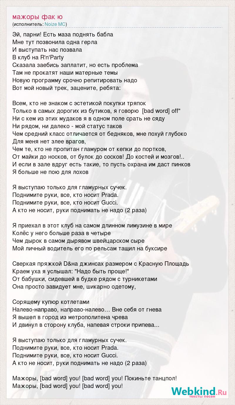 Эй, парни! Есть маза поднять бабла Мне тут позвонила одна герла И выступать нас позвала В клуб на R'n'Party Сказала заебись заплатит, но есть проблема Там не прокатят наши матерные темы Новую программу срочно репитировать надо Вот мой новый трек, зацените, ребята: Всем, кто не знаком с эстетикой покупки тряпок Только в самых дорогих из бутиков, я говорю [bad word] off" Ни с кем из этих мудаков я в одном поле срать не сяду Ни рядом, ни далеко - мой статус таков Чем средний класс отличается от бедняков, мне похуй глубоко Для меня нет злее врагов, Чем те, кто не пропитан гламуром от кепки до портков, От майки до носков, от булок до сосков! До костей и мозгов!.. И если в зале вдруг есть такие, то пусть охрана им даст пинков Я больше не пою для лохов Я выступаю только для гламурных сучек. Поднимите руки, все, кто носит Prada. Поднимите руки, все, кто носит Gucci. А кто не носит, руки поднимать не надо (2 раза) Я приехал в этот клуб на самом длинном лимузине в мире Колёс у него больше раза в четыре Чем дырок в самом дырявом швейцарском сыре Мой личный водитель его по рельсам тащил на буксире Сверкая пряжкой D&на джинсах размером с Красную Площадь Краем уха я услышал: "Надо быть проще!" От бабушки, сидевшей в будке рядом с турникетами Она просто завидует мне, шикарно одетому, Сорящему купюр котлетами Налево-направо, направо-налево… Вне себя от гнева Я вышел в город из метрополитена чрева И двинул в сторону клуба, напевая строки припева... Я выступаю только для гламурных сучек. Поднимите руки, все, кто носит Prada. Поднимите руки, все, кто носит Gucci. А кто не носит, руки поднимать не надо (2 раза) Мажоры, [bad word] you! [bad word] you! Покиньте танцпол! Мажоры, [bad word] you! [bad word] you!