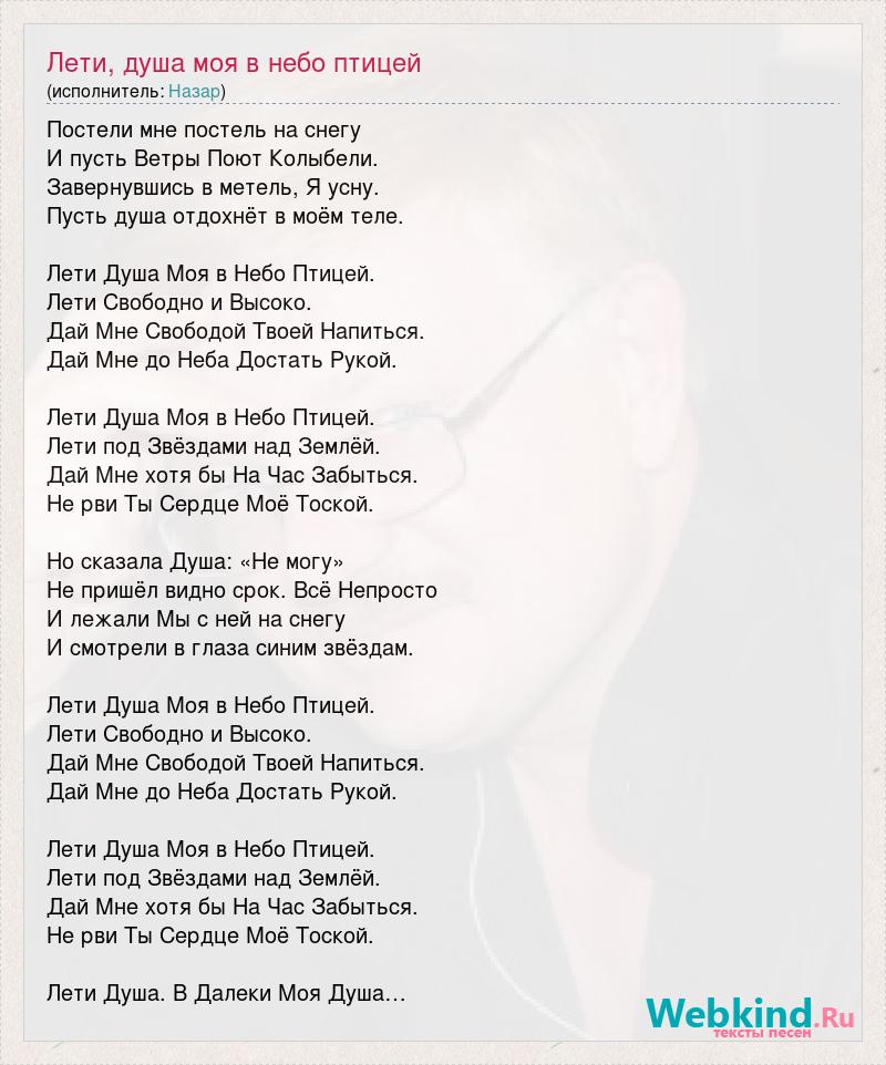Постели мне постель на снегу И пусть Ветры Поют Колыбели. Завернувшись в метель, Я усну. Пусть душа отдохнёт в моём теле. Лети Душа Моя в Небо Птицей. Лети Свободно и Высоко. Дай Мне Свободой Твоей Напиться. Дай Мне до Неба Достать Рукой. Лети Душа Моя в Небо Птицей. Лети под Звёздами над Землёй. Дай Мне хотя бы На Час Забыться. Не рви Ты Сердце Моё Тоской. Но сказала Душа: «Не могу» Не пришёл видно срок. Всё Непросто И лежали Мы с ней на снегу И смотрели в глаза синим звёздам. Лети Душа Моя в Небо Птицей. Лети Свободно и Высоко. Дай Мне Свободой Твоей Напиться. Дай Мне до Неба Достать Рукой. Лети Душа Моя в Небо Птицей. Лети под Звёздами над Землёй. Дай Мне хотя бы На Час Забыться. Не рви Ты Сердце Моё Тоской. Лети Душа. В Далеки Моя Душа…